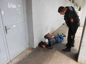 Dne 7.7.2015 v 12,30 hod., prováděla hlídka strážníků pochůzkovou činnost v obvodu Bukova, kde u zimního stadionu nalezla ležet na zemi spícího bezdomovce. Strážníci muže probudili, ale ten s hlídkou pro jeho značnou opilost nebyl schopen komunikovat. Šetřením bylo zjištěno, že se jedná o Františka Š.(1954), kterého hlídka po částečném vystřízlivění z místa vykázala. Asi o padesát metrů dále objevili strážníci v křoví spát další tři bezdomovce, které hlídka donutila nepořádek, který okolo sebe udělali uklidit a z místa byli strážníky taktéž vykázáni.