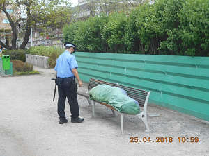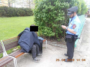 Dne 25.4.2018 v 10,50 hod., prováděla hlídka strážníků pochůzkovou činnost v centru města a jeho okolí, kde si v areálu Smetanových sadů všimla dvou bezdomovců, kteří zde spali na lavičkách. Šetřením bylo zjištěno, že se jedná o muže středního věku, bytem Mladá Boleslav a Duchcov. Strážníci oba muže probudili a po řádném poučení, jakého protiprávního jednání se svým chováním dopouštějí, je z místa vykázali.