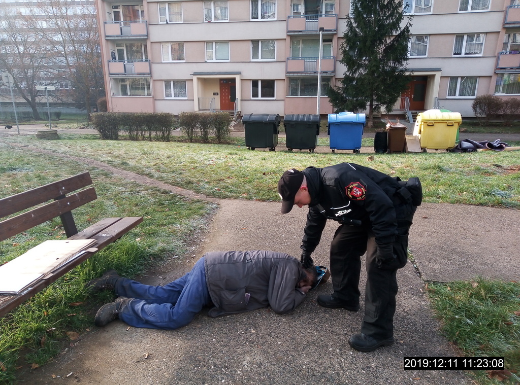 Dne 11.12.2019 v 11:20hod., byla na žádost operačního střediska městské policie provedena kontrola okolí ulic Ladova a Špálova, odkud na tísňovou linku městských strážníků telefonoval oznamovatel, který operátorovi sdělil, že v ulici Ladova leží bezvládně na zemi neznámý muž. Na místě hlídka strážníků zjistila spícího muže, který ležel vedle lavičky. Jednalo se o muže středního věku, který se nacházel v silně podnapilém stavu a díky tomuto stavu nebyl schopen se sám o sebe postarat. Dotyčný mluvil nesrozumitelně a na hlavě měl tržnou ránu. Z tohoto důvodu byla hlídkou přivolána zdravotná záchranná služba, která si opilce od strážníků převzala a převezla do Masarykovy nemocnice k vyšetření. Když se strážníci vraceli zpět k pochůzkové činnosti, zastihla je v ulici Sociální Péče zpráva, že se mají dostavit do Masarykovy nemocnice, kde se dle sdělení zdravotnického personálu měl nacházet muž bez domova, který svým jednáním obtěžuje své okolí. Ten byl strážníky zastižen u vchodu do budovy, kde seděl na zemi, vedle automatu na kávu. Muž z Děčína měl zarudlé, hnisavé pravé oko, starší odřeniny a modřiny na obličeji a stěžoval si na bolest celého těla. Z tohoto důvodu si hlídka vypůjčila od zdravotnického personálu kolečkové křeslo a převezla jej na příjem, kde byl předán k ošetření.