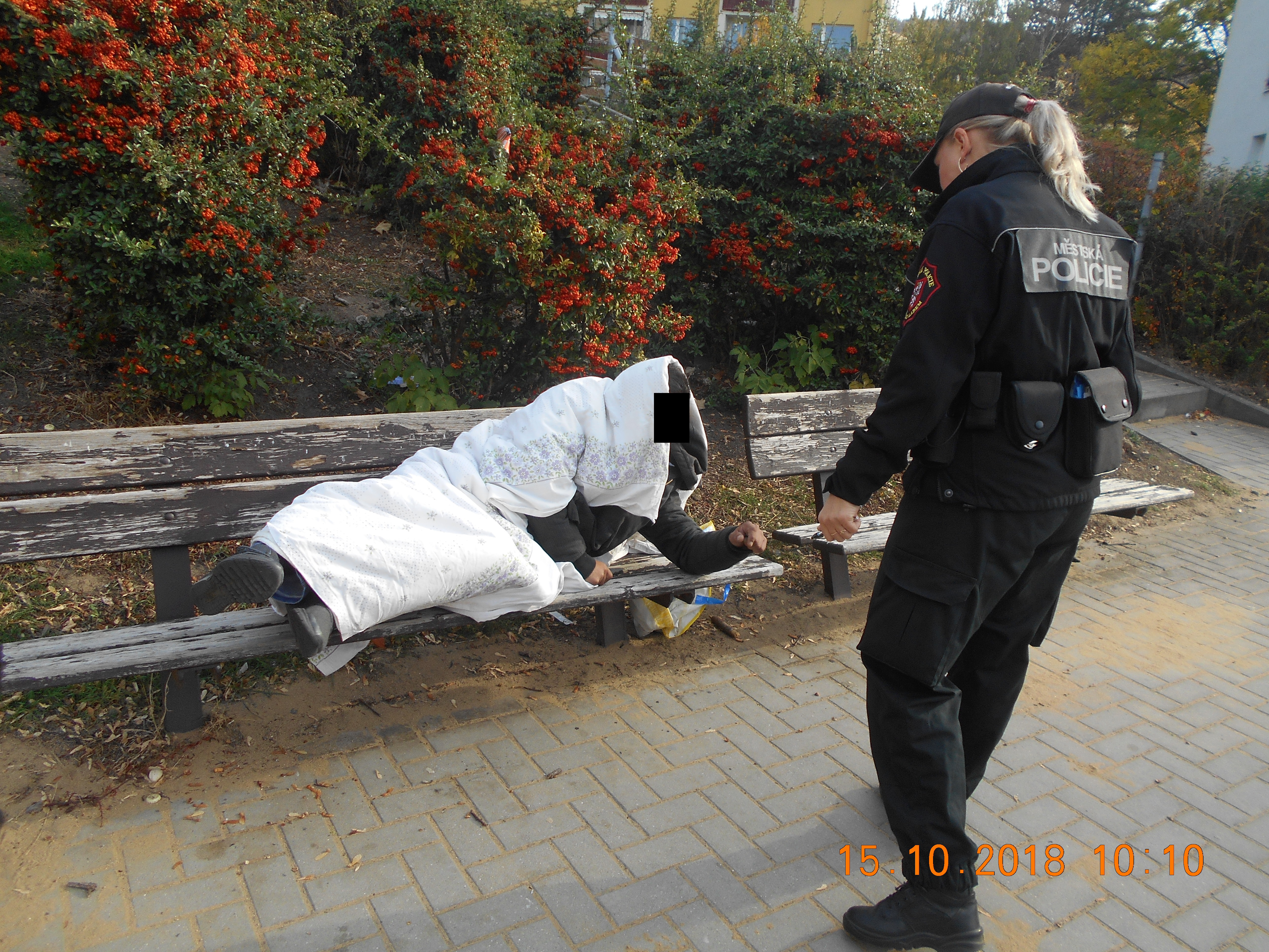 Dne 15.10 2018 v 09,45 hod., prováděla hlídka strážníků kontrolní činnost v obvodu Severní terasy, kde v ulici Orlická narazili na spícího bezdomovce ze Slovenska, který dřímal na lavičce a pod sebou měl na zemi značný nepořádek. Strážníci muže probudili a donutili ho odpadky po sobě uklidit. Po zadokumentování celé události a po řádném poučení, byl dotyčný z místa strážníky vykázán.