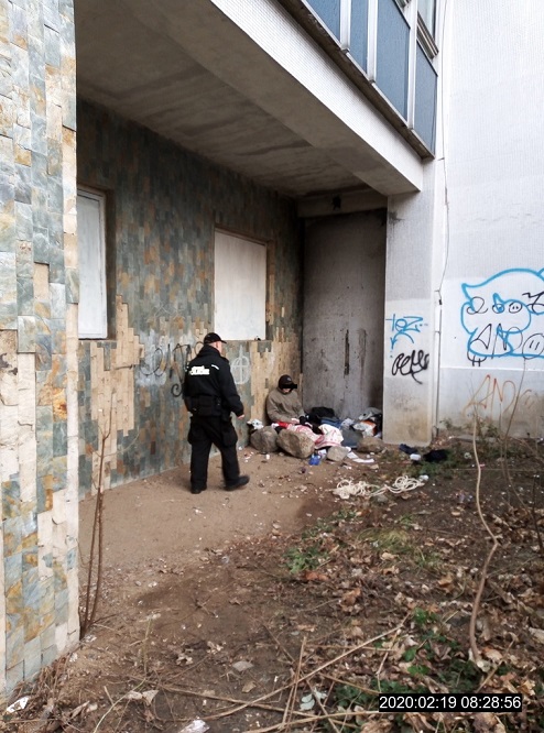 Dne 19.2.2020 v 8,20 hod., prováděla hlídka strážníků kontrolní činnost v obvodu Severní Terasy, kde před necelým týdnem proběhl velký úklid ve spolupráci městské policie a pracovníků ÚMO Severní Terasa. Hlídky navštívily místa, kde tento úklid proběhl a kontrolovaly, zda se do těchto míst nevracejí bezdomovci, kteří zde zmiňovaný nepořádek udělali. Pro strážníky nebylo ani velké překvapení, když v ulici Stavbařů nelezli pod římsou tamního gymnázia bivakovat muže středního věku, který měl kolem sebe značný nepořádek. Na dotaz strážníků, co zde dotyčný pohledává, muž odpověděl, že šel kolem a toto místo se mu zdálo vhodné k odpočinku. Strážníci bezdomovce upozornili na fakt, že toto místo bylo před nedávnem uklizeno, a že on zde vytvořil stejný nepořádek jako zde byl před úklidem. To dotyčný potvrdil s uznáním, že zde byl před jeho příchodem opravdu pořádek a odpadky, které zde odhodil po sobě uklidil. Strážníci muži vysvětlili, kam a na koho se má obrátit v situacích, kdy nemá kde spát nebo nemá co jíst. Po tomto poučení byl dotyčný z místa hlídkou vykázán.