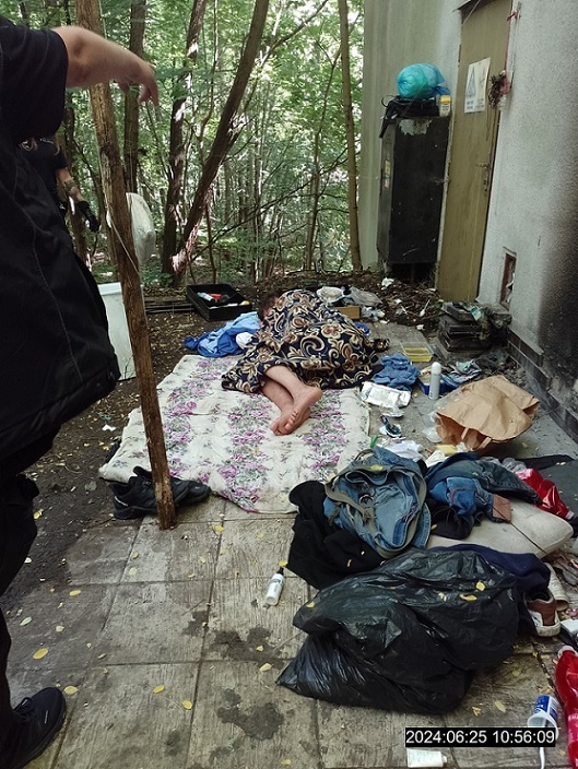Dne 25.6.2024 v 10:45 hod., byla na žádost operačního střediska městské policie provedena kontrola ulice Sociální péče, odkud na tísňovou linku městských strážníků telefonoval člen ostrahy, který operátorovi nahlásil bezdomovce, který měl údajně přebývat v areálu Masarykovy nemocnice. Strážníci dotyčného objevili spícího za jedním z nemocničních pavilonů. Jednalo se o hlídce notoricky známého bezdomovce středního věku, kterého strážníci probudili a po řádném poučení z areálu nemocnice vykázali. Vzhledem k tomu, že po bezdomovci zbyl na místě značný nepořádek, bude tento odklizen správou nemocnice, které byla celá událost nahlášena.