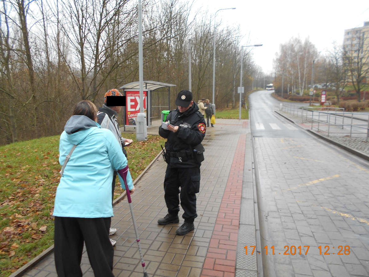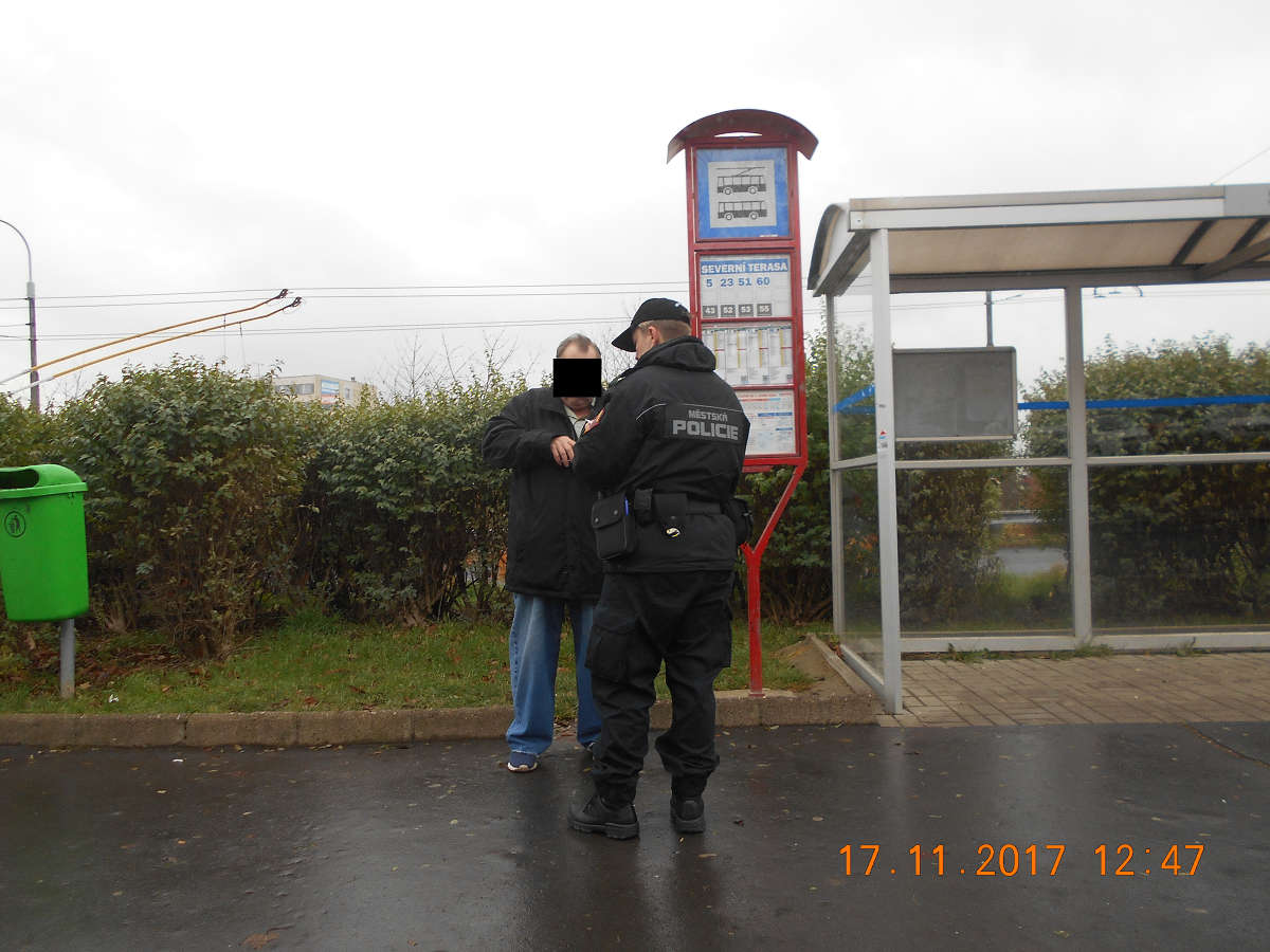 Dne 17.11.2017 byla v obvodu Severní Terasy provedena preventivně bezpečnostní akce, zaměřená na porušování zákazu kouření v prostorách autobusových zastávek městské hromadné dopravy. Při této kontrole byly zjištěny dvě osoby, které tento zákaz porušovaly, proto strážníci uložili v jednom případě blokovou pokutu ve výši dvě stě korun a v druhém případě byl přestupek předán k dořešení příslušné přestupkové komisi.