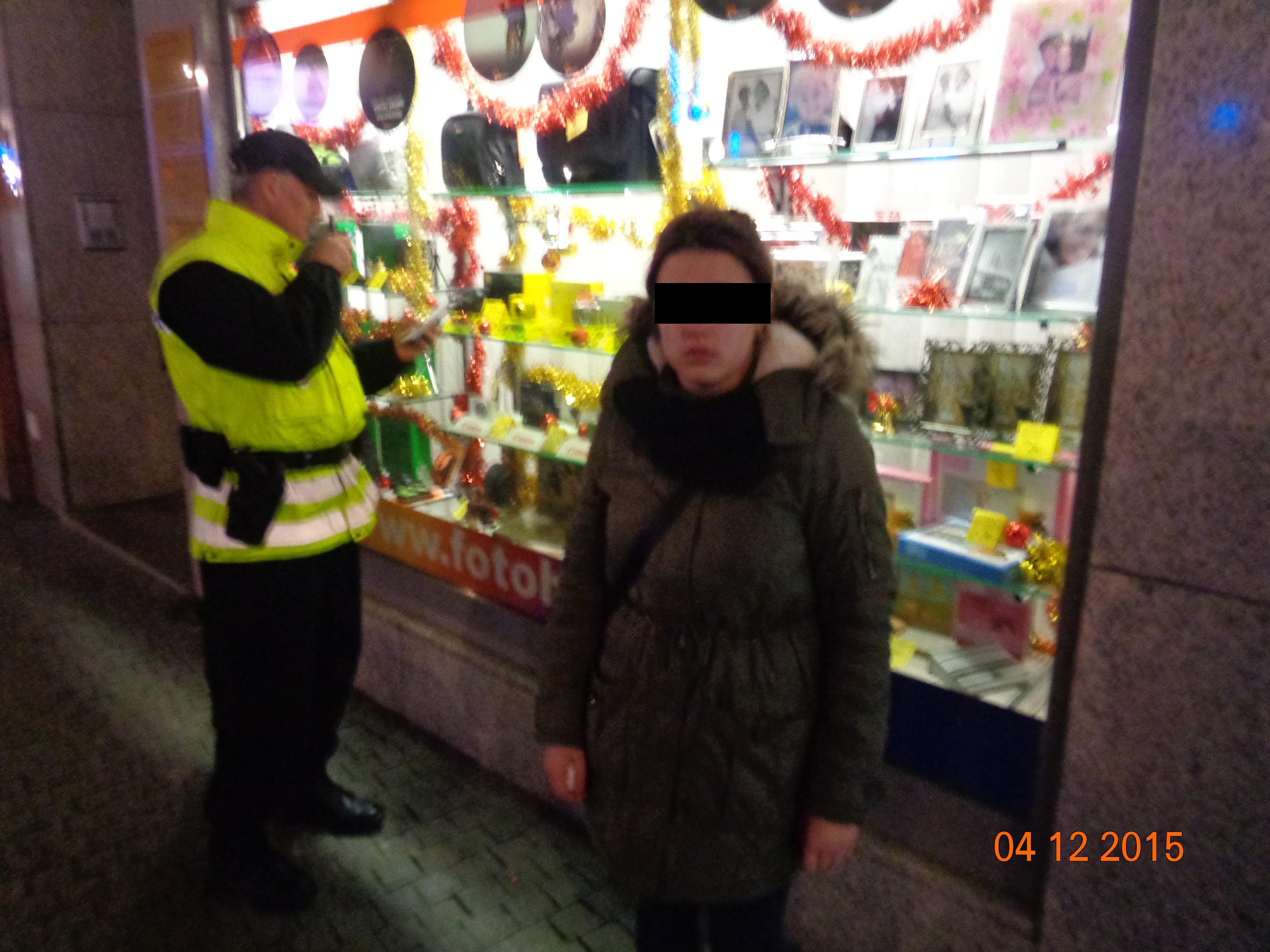 Dne 04.12.2015 v 20.45 hod., prováděla hlídka strážníků pochůzkovou činnost v centru města, kde si na Mírovém náměstí všimla ženy, která odpovídala popisu hledané osoby Policií ČR. Při kontrole podezřelé osoby bylo zjištěno, že se jedná o Naděždu Č.(1998), bytem Jablonec nad Nisou, která utekla z výchovného zařízení v Kostomlatech. Na místo byla přivolána hlídka Policie ČR, která si jmenovanou převzala k dalšímu šetření.