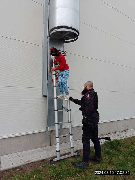 Dne 10.3.2024 v 17,00 hod., byla na žádost operačního střediska městské policie vyslána hlídka strážníků do ulice Krčínova, odkud na tísňovou linku městské policie telefonoval oznamovatel, který operátorovi sdělil, že po střeše supermarketu Lidl mají běhat děti. Strážníci na místě zjistili, že se na střeše pohybuje malý kluk, který před hlídkou utekl a dívka, která se zasekla na žebříku a nemohla slézt dolů. Strážníci na místo přivolali své kolegy ze skupiny operačního zákroku, kteří přijeli s žebříkem a zaklíněnou dívku sundali.