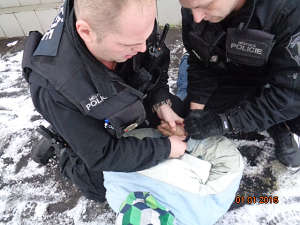 Dne 1.1.2016 v 10.15 hod., byl na žádost operačního střediska městské policie proveden výjezd strážníků do obvodu Předlic, odkud na tísňovou linku městské policie telefonoval oznamovatel, který operátorovi sdělil, že v ulici Hrbovická neznámý muž ohrožuje osádku osobního vozidla sekerou. Na uvedené místo se sjely dvě hlídky strážníků, ale nikdo zde již nebyl zastižen. Z tohoto důvodu se hlídky rozdělily a začaly provádět kontrolu okolí. Asi za dvě minuty si strážníci ze skupiny operačního zákroku všimli v ulici Marxova neznámého muže, který u místní trafostanice sekerou sekal do visacího zámku a něco nesrozumitelného vykřikoval. Hlídka u muže zastavila a když vystoupila z vozidla, neznámý se na ně otočil a s napřaženýma rukami nad hlavou, ve kterých držel sekeru a se slovy „ tak pojďte,“ se vydal směrem ke služebnímu vozidlu proti hlídce. Z důvodu bezprostředního ohrožení hlídky, použili oba strážníci proti útočníkovi donucovací prostředky a dotyčného muže zpacifikovali. Šetřením bylo zjištěno, že se jedná o Marka Č.(1993), bytem Trmice. Vzhledem k tomu, že jmenovaný neustále mluvil o věcech, které nedávaly smysl a vykazoval známky požití alkoholu nebo jiné návykové látky, byla na místo přivolána zdravotní záchranná služba, která si dotyčného převezla do Masarykovy nemocnice na oddělení psychiatrie k vyšetření.