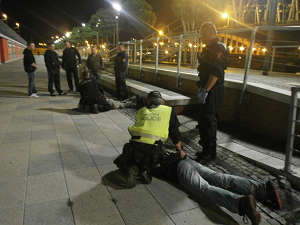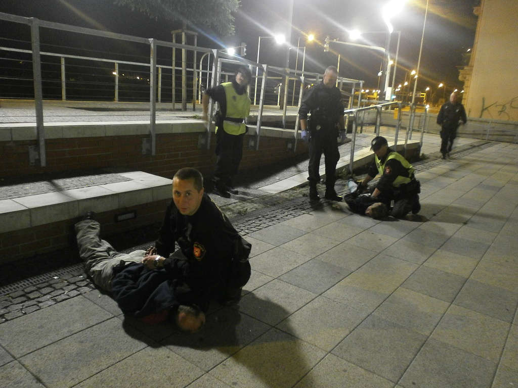 Dne 13.09.2013 ve 22.40 hodin, byla na žádost operačního střediska Městské policie v Ústí n/L vyslána hlídka strážníků do herny "U Žáby" ulici Dlouhá, z důvodu oznámení Policie ČR, která sdělila, že zde došlo k loupežnému přepadení se zbraní v ruce, a s tím související žádosti Policie ČR o asistenci při plnění úkonů v souvislosti s šetřením událostí na místě. Během této asistence se strážníci seznámili s popisem pachatelů výše uvedeného loupežného přepadení, a to shlédnutím záznamu kamerového systému. Vzhledem k tomu, že obsluhující Marie M.( 1993) utrpěla psychický šok, přivolali strážníci na místo rychlou záchrannou službu, která jmenovanou ošetřila a odvezla si ji do Masarykovy nemocnice k dalšímu ošetření.Dále hlídka strážníků předala popis obou pachatelů svým kolegům a všichni začali pátrat po mužích, kteří odpovídali danému popisu. Když strážníci prováděli kontrolu na Hlavním vlakovém nádraží, všimli si dvou mužů, kteří odpovídali popisu pachatelů, proto si na pomoc přivolali Policii ČR. Hlídkám se podařilo nenápadně přistoupit k oběma mužům, kteří v tu dobu seděli na betonové podezdívce vedle schodiště vedoucího ke zdejší železné lávce. Zasahující hlídky, vědomi si faktu, že se jedná o nebezpečné pachatele, použily výzvy "jménem zákona" a současně použily hrozby namířenou střelnou zbraní. Dále přikázaly oběma mužům, aby sepjali ruce za hlavou a lehli si tváří k zemi. Této výzvy oba muži okamžitě uposlechli. Společně s hlídkou Policie ČR strážníci oba muže spoutali. Šetřením bylo zjištěno, že se jedná o Jana V.(1965) a Jakuba A.(1990), oba bytem Děčín. Po tomto aktu si oba zadržené převezla Policie ČR k dalšímu šetření.
