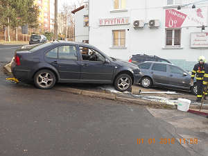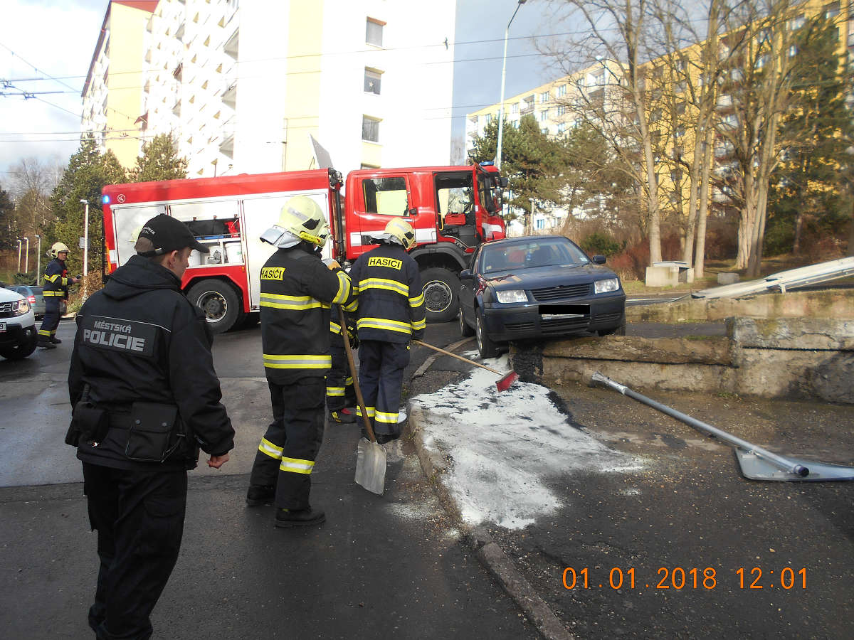 Dne 1.1.2018 v 11.50 hod., byla na žádost operačního střediska městské policie vyslána hlídka strážníků do ulice V Rokli, z důvodu telefonického oznámení, že u provozovny U Pivína došlo k dopravní nehodě osobního automobilu.. Po příjezdu hlídky na místo bylo zjištěno, že řidič vozidla dostal při projíždění pravotočivé zatáčky smyk, vozidlo se stalo neovladatelné a tím pádem došlo k dopravní nehodě, při které byla poškozena dopravní značka a u zmiňovaného vozidla byla nárazem poškozena olejová nádrž, ze které unikala kapalina. Na místo byli přivoláni hasiči, kteří uniklou kapalinu posypali sorbentem. Během zásahu hasičů strážníci usměrňovali dopravu. Případ si k dořešení převzala Policie ČR.