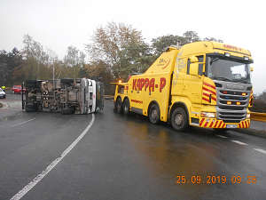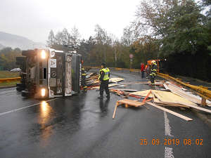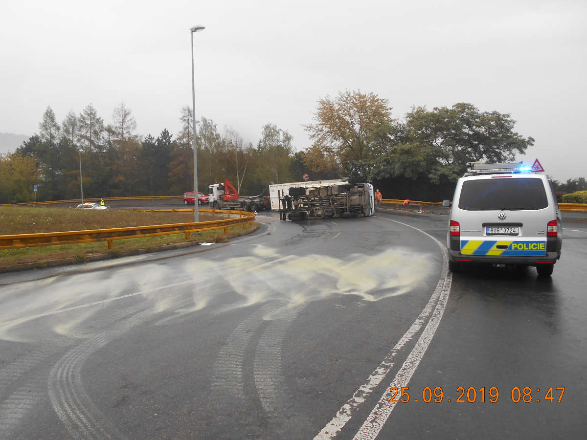 Dne 25.9.2019 v 07:55 hod., byla na žádost operačního střediska městské policie vyslána hlídka strážníků do ulice Výstupní, z důvodu telefonického oznámení na tísňovou linku městské policie, kdy oznamovatel nahlásil dopravní nehodu ve směru na Krásné Březno, kde se na vozovce převrátilo na bok nákladní vozidlo. Po příjezdu hlídky na místo bylo zjištěno, že oznámení se zakládá na pravdě. Veškeré složky IZS byly již vyrozuměny. U dopravní nehody bylo zjištěno, že se jedná o nákladní vozidlo, které se převrátilo na bok a došlo ke zranění řidiče, kterého zdravotní záchranná služba odvezla do Masarykovy nemocnice k ošetření. Hasiči zasypali vzniklé olejové skvrny sorbentem a vozovku posléze zbavili nečistot. Strážníci po dobu zásahu hasičů usměrňovali dopravu. Celou událost si převzala k došetření Policie ČR.