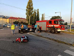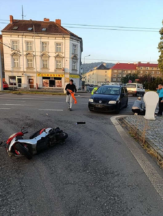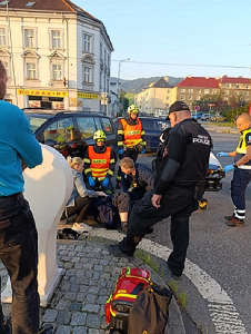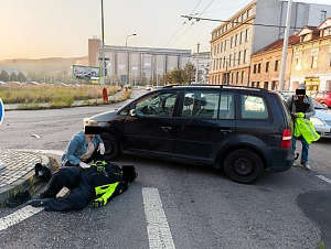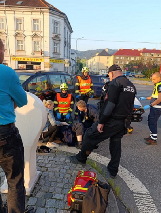 Dne 18.9.2024 v 07,20 hod., prováděla hlídka střekovských strážníků kontrolní činnost v ulici Národního odboje u Benešova mostu, kde za sebou zaslechla hlasitou ránu a když se strážníci otočili, spatřili vozidlo v křižovatce a následně muže ležícího na zemi a opodál viděli ležet skútr. Proto se hlídka okamžitě vydala k místu dopravní nehody (křižovatka Národního Odboje a Kramoly). Na místě se nacházela žena, která hlídce uvedla, že je sestřička z KZ z JIP. Dotyčná muže, který byl sražen osobním vozidlem VW okamžitě zběžně prohlédla, aby zjistila, zda a jaká má muž zranění. Ten byl plně při vědomí a uvedl, že je diabetik a že ho bolí jen koleno. Na místo byla přivolána zdravotní záchranná služba, hasiči a hlídka Policie ČR – dopravní nehody. Tyto složky si celý případ převzaly k dalšímu šetření. Strážníci pomohli zdravotníkům naložit zraněného muže na nosítka a poté usměrňovali dopravu.