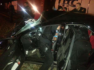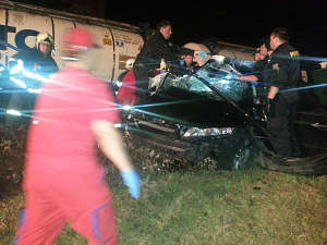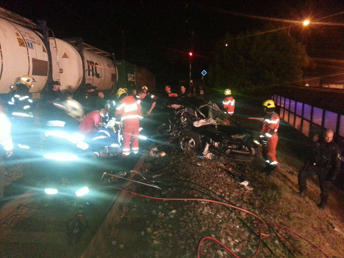 Dne 11.6. v 23, 50 hod., byly operačním střediskem městské policie vyslány hlídky strážníků do ulice Žukovova, kde na místním železničním přejezdu mělo dojít k vážné dopravní nehodě, mezi osobní vozidlem a nákladním vlakem. Na místě strážníci zjistili, že se zde nacházejí tři zraněné osoby, proto byla přivolána rychlá záchranná služba, hasiči a Policie ČR. Do příjezdu těchto složek strážníci z vozidla vyprostili jednoho muže, který si stěžoval na bolesti dolních končetin. Strážníci muži poskytli první pomoc a odnesli ho na trávník, mimo prostor železničního tělesa. Tento muž hlídce sdělil, že na přejezd vjeli i přesto, že byla spuštěna výstražná zvuková i světelná signalizace. Následně se na místo dostavila hlídka strážníků z Plzně, kteří zde provádějí strážní službu v rámci povodní, na základě veřejnoprávní smlouvy mezi městy Ústí nad Labem a Plzní.Společně se jim podařilo vyprostit druhého muže, který neměl viditelná zranění. Třetího muže, který seděl na místě spolujezdce se strážníků vyprostit nepodařilo, z důvodu zaklínění spodních končetin pod palubní deskou. Strážníci proto zajistili zraněnému muži základní životní funkce, a to zajištění krční páteře fixací, zaškrcení pravé končetiny nad kolenem z důvodu silného krvácení a velké krevní ztráty. Po krátké chvíli se na místo dostavili hasiči, kteří zraněného vyprostili a rychlá záchranná služba, která si zraněné převzala k dalšímu ošetření. Na místo se dostavila i Policie ČR, která si celý případ převzala k dalšímu šetření.