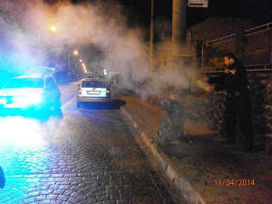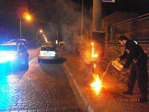 Dne 14.4.2014 v 02,05 hod., byl na žádost operačního střediska městské policie proveden výjezd strážníků do ulice Svádovská, kde dle sdělené neznámého oznamovatele měl hořet odpadkový koš a oheň měl ohrožovat označník zastávky. Strážníci po příjezdu na místo oheň uhasili vodou z kanistru, který měli s sebou ve služebním vozidle. Po uhašení ohně se na místo dostavili i hasiči, kteří zahašení koše ještě zkontrolovali.