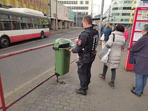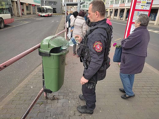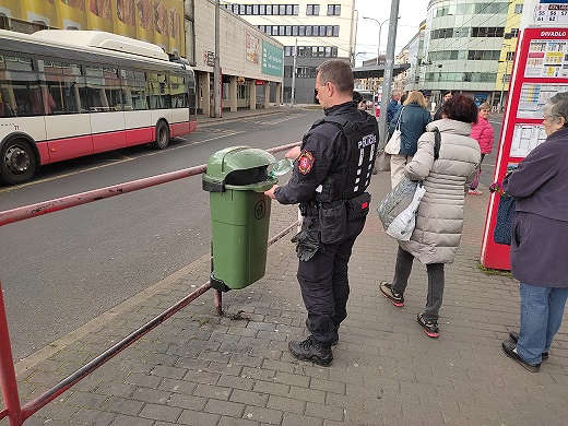 Dne 26.4.2023 v 11,20 hod. prováděla hlídka strážníků kontrolní činnost v centru města, kde byla oslovena procházející ženou, která strážníkům sdělila, že na zastávce MHD v ulici Revoluční u nástupního ostrůvku, hoří odpadkový koš. Ten měl dle tvrzení ženy zahořet po vhození nedopalku cigarety neznámým mužem. Strážníci na místo přivolali služební vozidlo, ve kterém je pro tyto případy uložena v pet lahvích voda a začínající oheň uhasila. Muže, který do odpadkového koše nedopalek cigarety odhodil se nalézt nepodařilo.