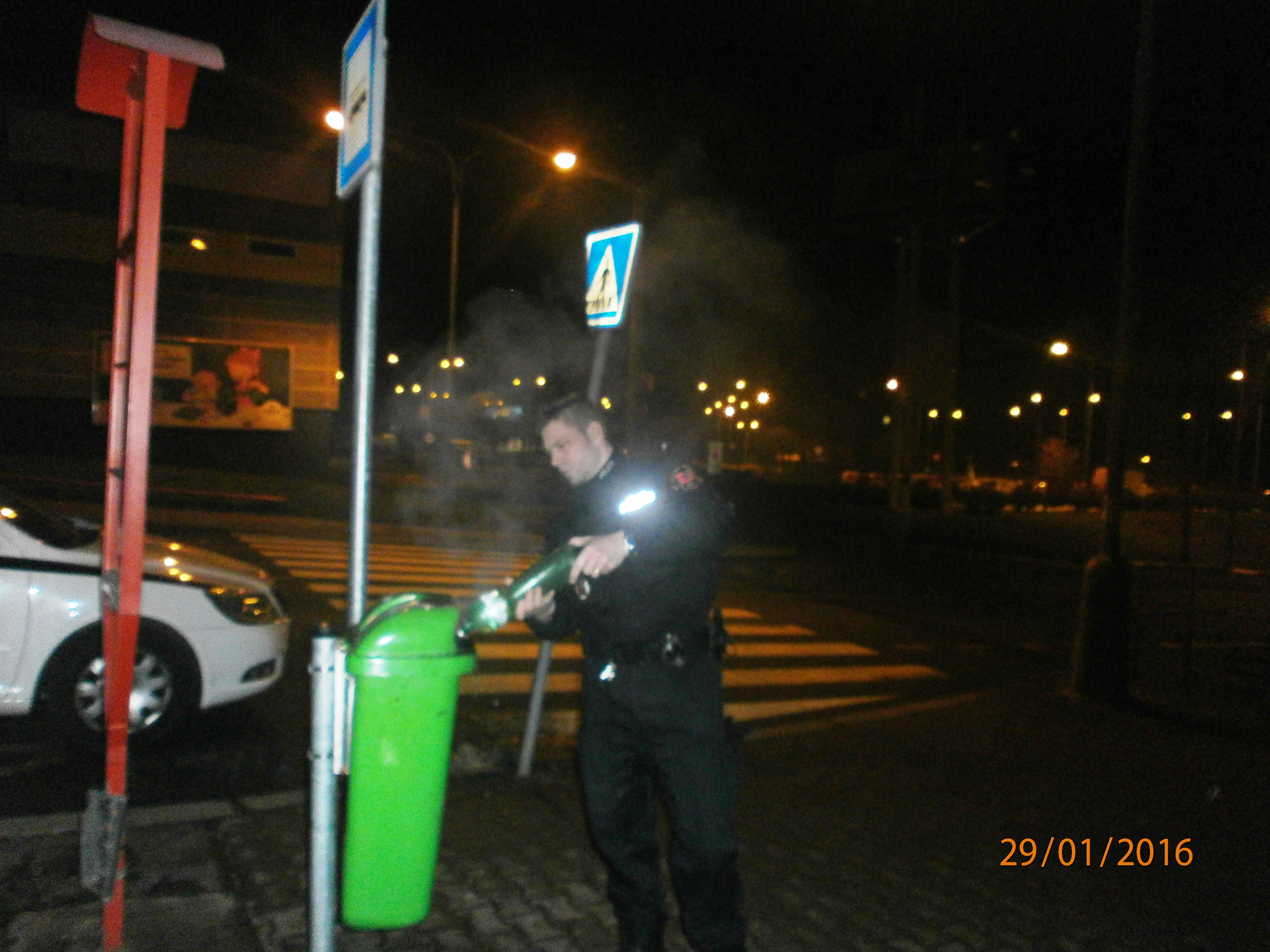 Dne 29.1.2016 v 00,50 hod., prováděla hlídka strážníků na Severní Terase kontrolní činnost v ulici Krušnohorská, kde strážníci ucítili kouř, připomínající pálení umělé hmoty. Hlídka se vydala směrem odkud zápach přicházel a asi po sto metrech si strážníci všimli hustého dýmu, který vycházel z odpadkového koše. Strážníci si ze služebního vozidla přinesli petlahev s vodou a vznikající oheň uhasili. Vzhledem k tomu, že zahoření bylo zavčasu zlikvidováno a na odpadkovém koši nevznikla žádná škoda, nebylo třeba na místo volat hasiče.