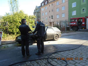 Dne 17. 05. 2020 v 17:34 hodin, byla vyslána hlídka strážníků do ulice Varšavská, kde dle oznamovatele mělo docházet k zahoření osobního vozidla. Strážníci na místě zjistili, že se jedná o osobní vozidlo značky Alfa Romeo, ze kterého vycházel z podkapoty motoru hustý dým. Strážníci ihned na místo přivolali hasiče neboť se u podběhu vozidla začaly objevovat i plameny a zároveň se pokoušeli vozidlo uhasit vlastními hasícími prostředky. Oheň se jim nedařilo uhasit, proto jeden ze strážníků vyzval přihlížející občany, aby se odebrali do bezpečné vzdálenosti. V tomto okamžiku se na místo dostavili hasiči, kteří strážníky v hašení vozidla vystřídali. Hlídka strážníků zabezpečovala místo požáru proti vstupu nepovolaných osob až do chvíle, kdy se hasičům podařilo oheň uhasit. Na místo se dostavila i hlídka Policie ČR, která si případ převzala k šetření.