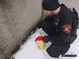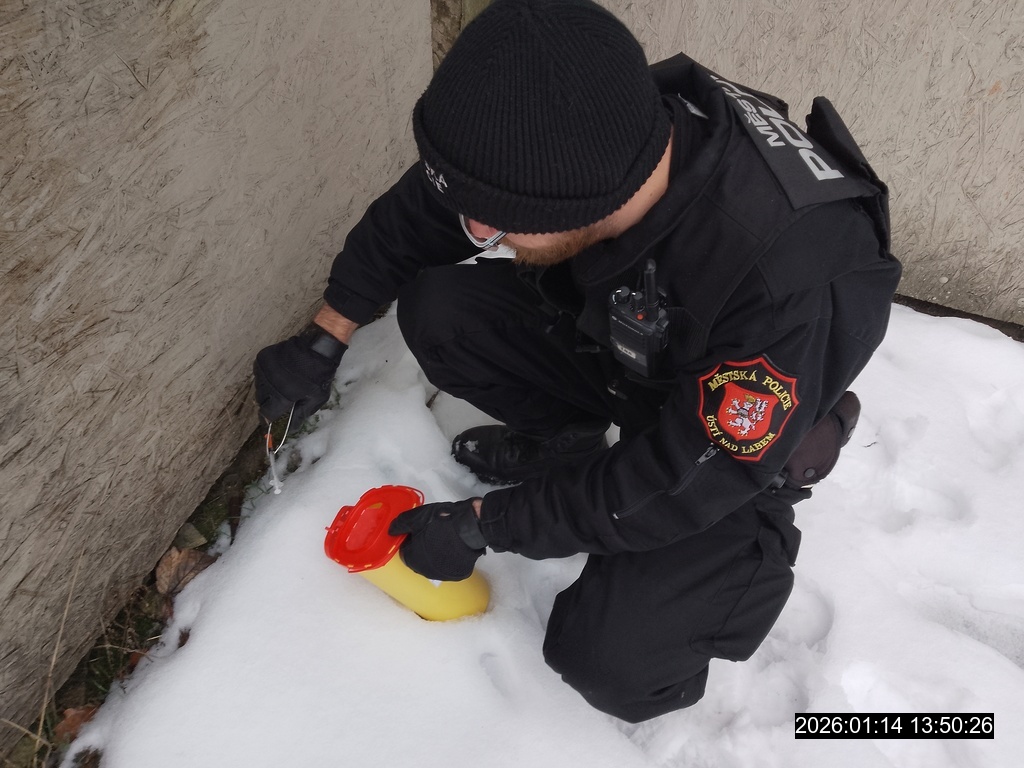 Dne 14.1.2026 v odpoledních hodinách prováděla hlídka strážníků kontrolní činnost v obvodu Severní Terasy, zaměřenou na čistotu města a na místa, kde občas přespávají lidé bez domova. V ulici Jana Zajíce strážníci narazili na zákoutí, kde nalezli odhozenou injekční stříkačku. Tato byla sebrána a vložena do nádoby na nebezpečný odpad.