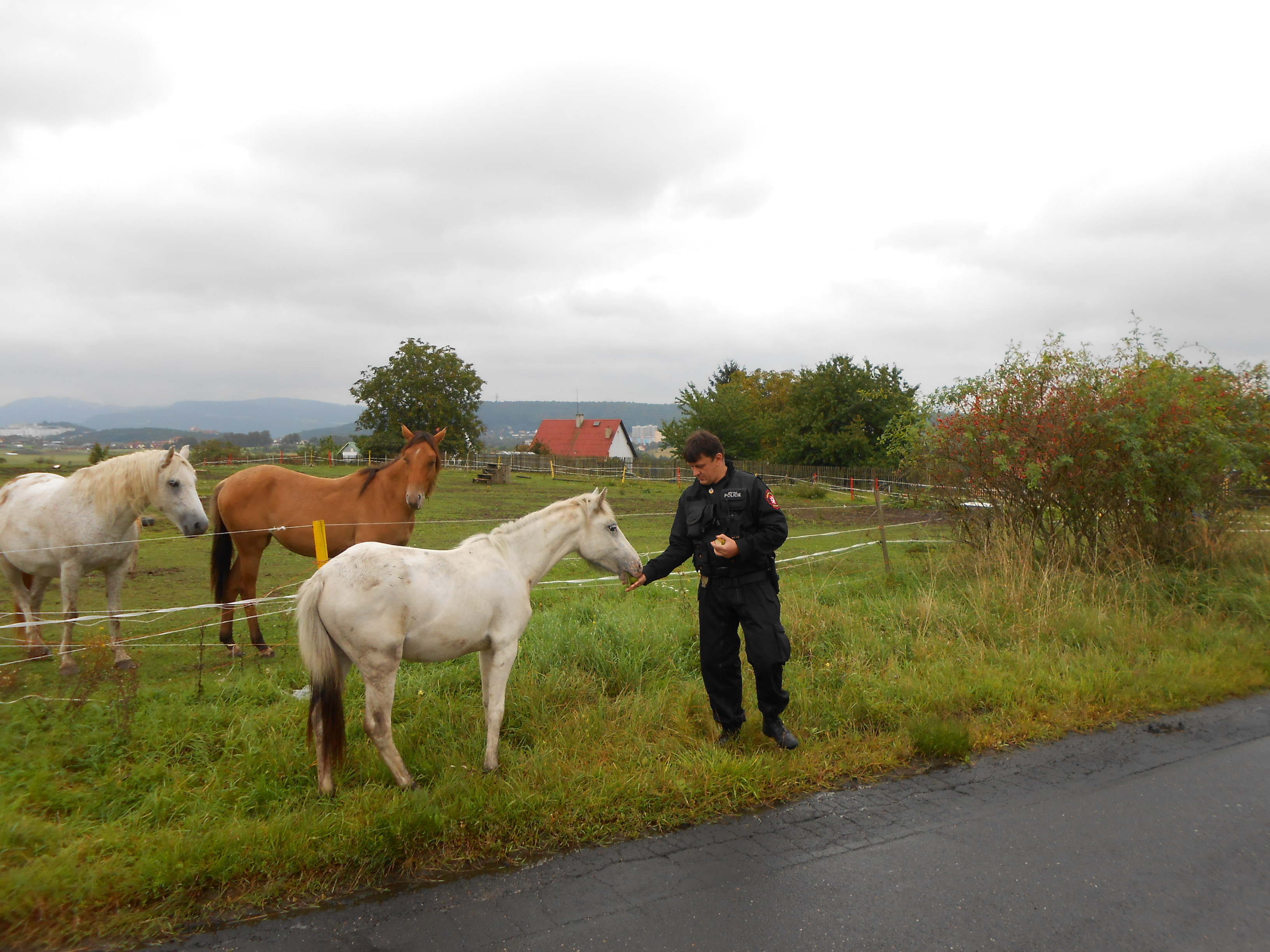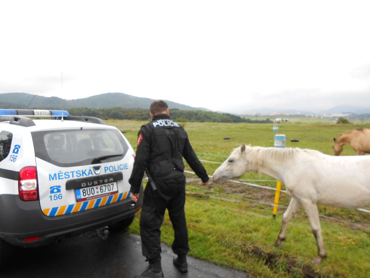 Dne 2.9.2014 v 09,25 hod., telefonoval na tísňovou linku městské policie neznámý muž, který operátorovi sdělil, že po obci Hrbovice pobíhají po vozovce volně koně a ohrožují bezpečnost silničního provozu. Na místo byla ihned vyslána hlídka strážníků, která zjistila, že šest koní se dostalo z ohrady a rozutekli se po okolí. Strážníci vyrozuměli o situaci majitelku koní a než se dotyčná dostavila na místo, podařilo se jim koně nahnat zpět do ohrady.