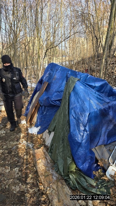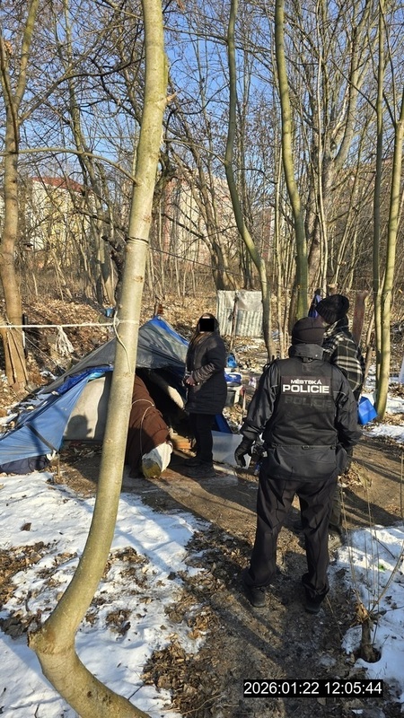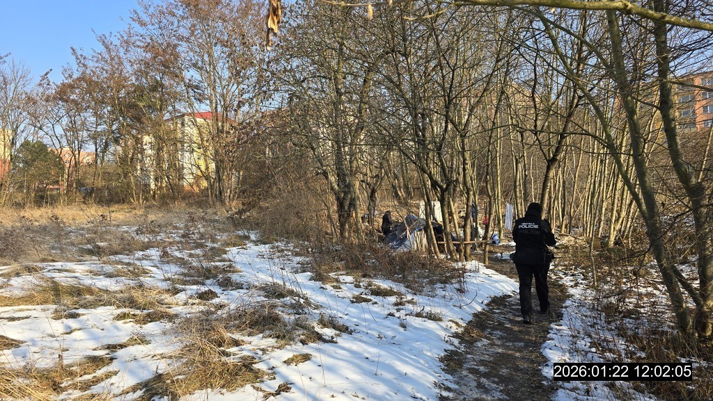 Dne 22.1.2026 ve 12:05 hod,. bylo při kontrolní činnosti strážníků městské policie v obvodu Severní Terasy zjištěno nové místo, kde se zdržují bezdomovci. Jedná se o prostor zalesněného prostranství nad ulicí Sociální péče. Vzhledem k tomu, že prostor, kde se tito bezdomovci zdržují je soukromý pozemek, byli bezdomovci hlídkou pouze obeznámeni, kam a na koho se mohou obrátit v situacích, kdy nemají kde spát, nebo trpí nedostatkem potravin.