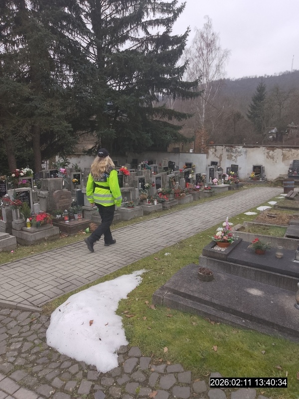 Dne 11.2.2026 v 13.30 hod., byla na žádost občana provedena kontrolní činnost na hřbitově v Krásném Březně, se zaměřením na pohyb závadových osob. Upozornění se týkalo lidí bez domova, kteří se pohybovali v okolí hřbitova a dotyčný měl obavy, aby ze strany těchto osob nedošlo k nějakému protiprávnímu jednání uvnitř tohoto pietního místa. Kontroly hřbitova a jeho okolí bude namátkově kontrolováno.
