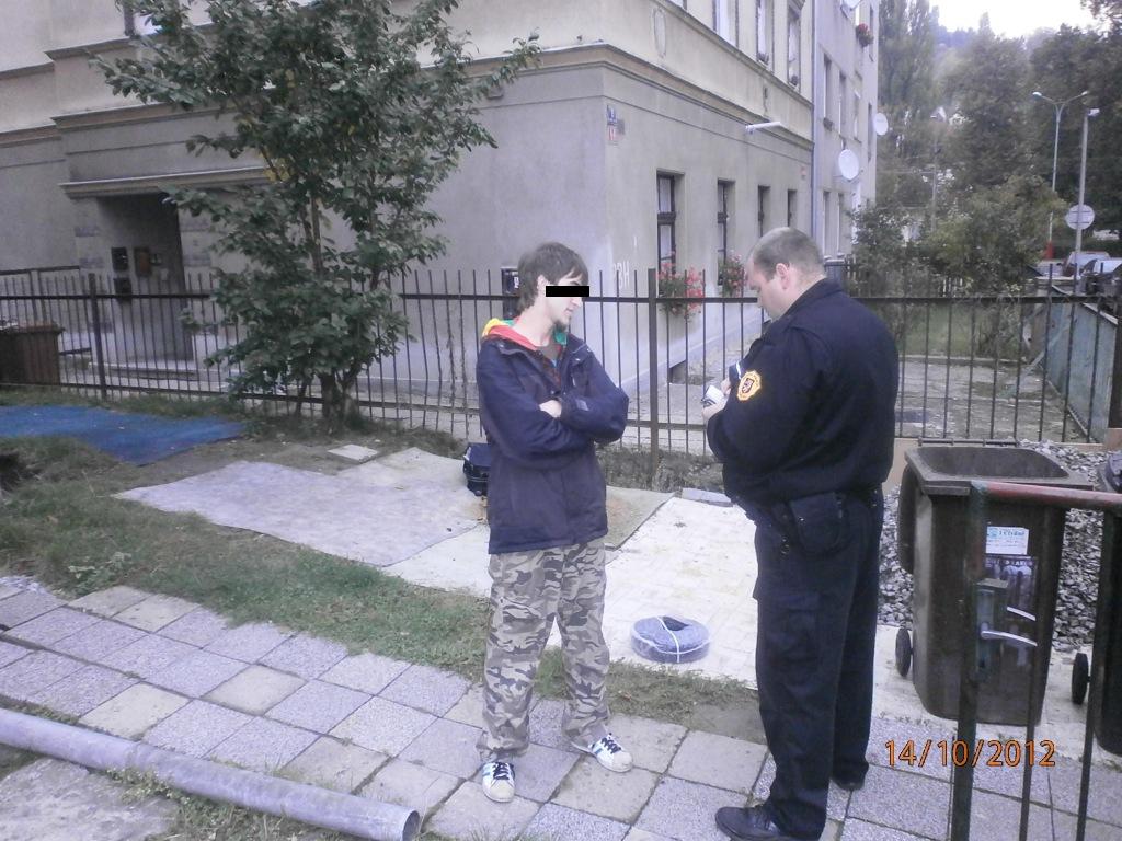Dne 14.10.2012 v 07.45 hodin, telefonoval na tísňovou linku městské policie neznámý občan, který uvedl, že v ulici Vilová ulička kradou dva muži nějaké věci z místní zahrady. Po příjezdu hlídky na místo si jeden ze strážníků všiml muže, který se po spatření hlídky dal na útěk, druhý muž byl hlídkou zadržen na místě. Šetřením bylo zjištěno, že se jedná o Jana N.(1992), který strážníkům sdělil, že zde odcizili tři kluba silových elektrických kabelů, které se svým komplicem chtěli někde zpeněžit. Na místo byla přivolána Policie ČR, která si celý případ převzala k dořešení.