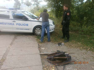 Dne 25.8.2014 v 12.50 hod., prováděla hlídka strážníků pochůzkovou činnost v obvodu Severní Terasa, kde si v zahrádkářské kolonii v ulici Na vrstevnici všimla muže, který ohýbal železnou tyč a okolo něho se povalovaly různé železné předměty. Šetřením bylo zjištěno, se jedná o Miroslava B.(1971), který na dotaz, kde ke všemu železu přišel odpověděl, že vše nalezl v blízkém okolí. Strážníci zkontrolovali okolní zahrádky a zde objevili několik poškozených drátěných plotů a v nedalekém křoví ukryté části okapů, parapetů a železné trubky. K těmto věcem se přihlásil jmenovaný, který se později přiznal k tomu, že vše odcizil z jedné ze zahrádek, u které vystříhal díru v pletivu, aby se dostal do zahrady. Vzhledem k výši škody, kterou dotyčný svým jednání způsobil, byla na místo přivolána Policie ČR, která si celý případ převzala k dořešení.