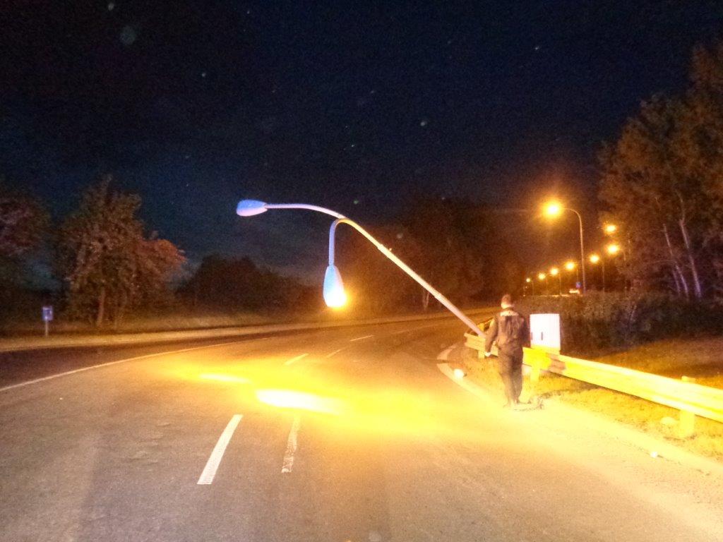 Dne 3.5.2016 v 21,30 hod., byl na žádost operačního střediska městské policie proveden výjezd strážníků do ulice Výstupní, kde dle sdělení oznamovatele mělo dojít k náklonu lampy veřejného osvětlení do vozovky. Strážníci na místě odkláněli provoz a přivolaní pracovníci příslušné správcovské firmy lampu odpojili od proudu a posléze stožár z vozovky odstranili.
