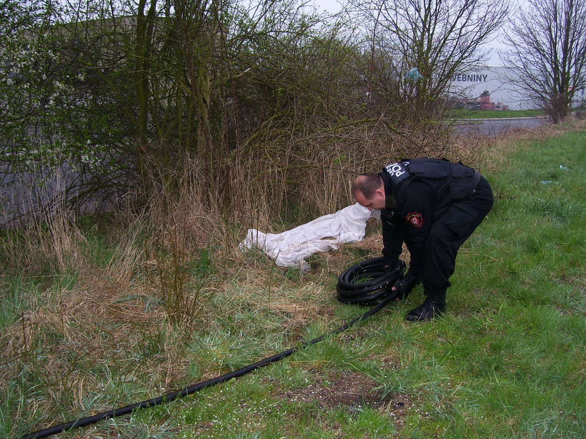 V ulicxi Jateční v nedalekém křoví nalezli strážníci ukrytý měděný kabel.
