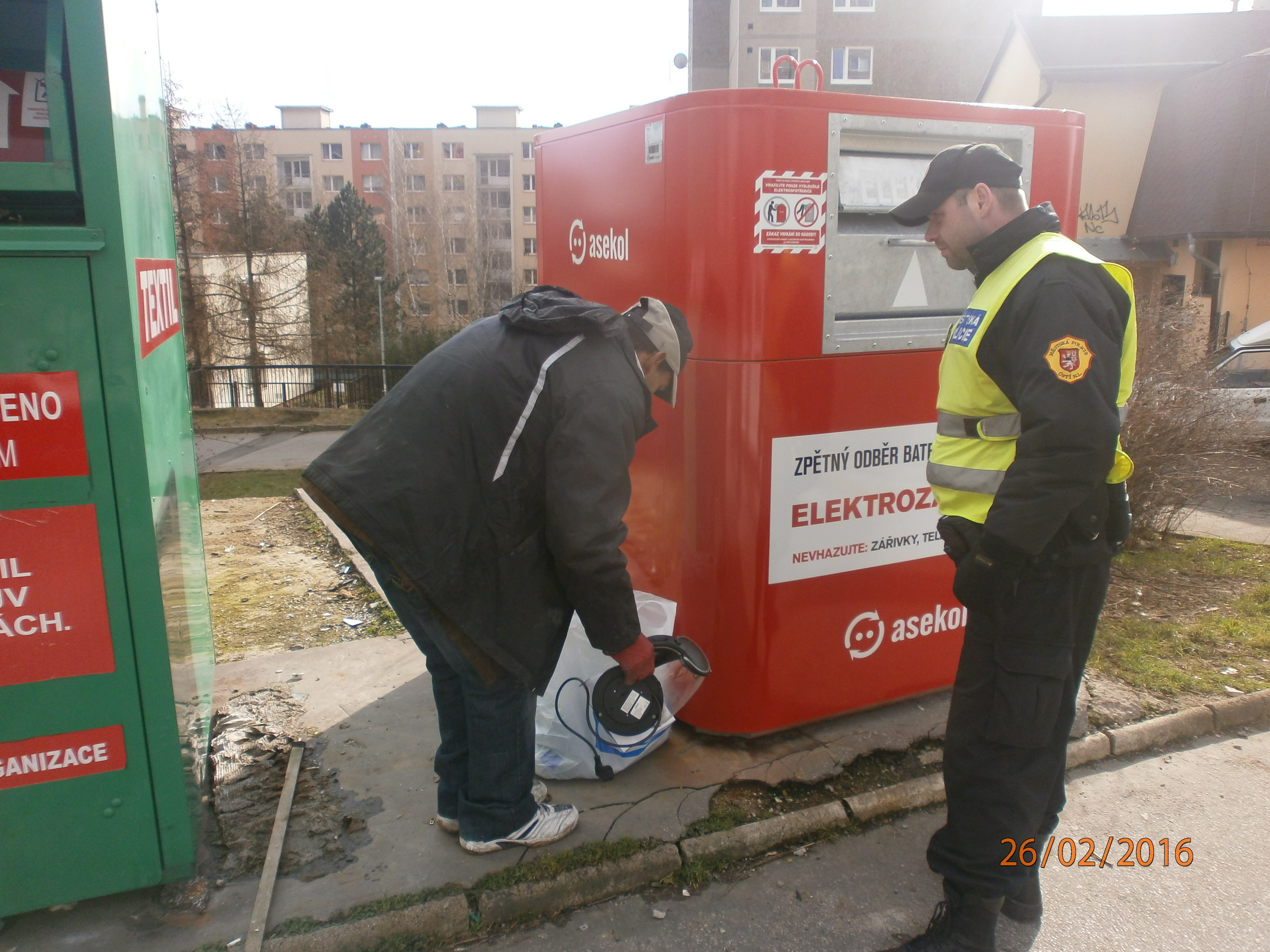 Dne 26.2.2016 v 11,55 hod., prováděla hlídka strážníků pochůzkovou činnost v obvodu Severní Terasy, kde si v ulici Šrámkova všimla muže, který byl horní půlí těla ponořen do kontejneru na elektroodpad, odkud se snažil vyhrabat různé elektrosoučástky. Strážníci muže z kontejneru vytáhli a seznámili ho s jeho protiprávním jednáním. Zároveň dotyčnému odebrali všechny předměty, které se mu podařilo z kontejneru vyndat. Ty posléze vrátili zpět do kontejneru. Šetřením bylo zjištěno, že se jedná o Petera B.(1978), bytem Ústí nad Labem, který byl po řádném poučení strážníky z místa vykázán.