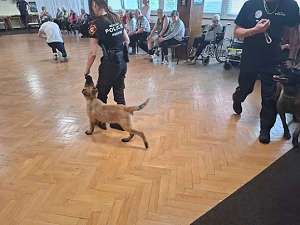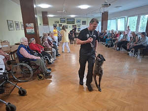 Dne 21.5.2025 se vydali strážníci z kynologické služby mezi seniory, tentokrát do domova důchodců v Krásném Březně. Setkání proběhlo ve společenské místnosti, kde se senioři a zaměstnanci domova shromáždili a vyčkávali na ukázky výcviku psů městské policie. Samozřejmě zde nemohl chybět ani psí benjamínek Dar. I pro něho to byl zajímavý zážitek, neboť poprvé ve svém výcviku byla použita střelba z pistole. Nutno dodat, že hluk z pistole s ním ani nehnul. Snahou psovodů bylo přiblížit svoji práci všem zúčastněným a zároveň zpestřit den samotným seniorům. Ty nejvíce zaujalo zadržení pachatele, kterého se zúčastnil i Dar, což mělo velký úspěch. Další prezentace kynologické služby městské policie bude pokračoval v Domově pro seniory v Doběticích.