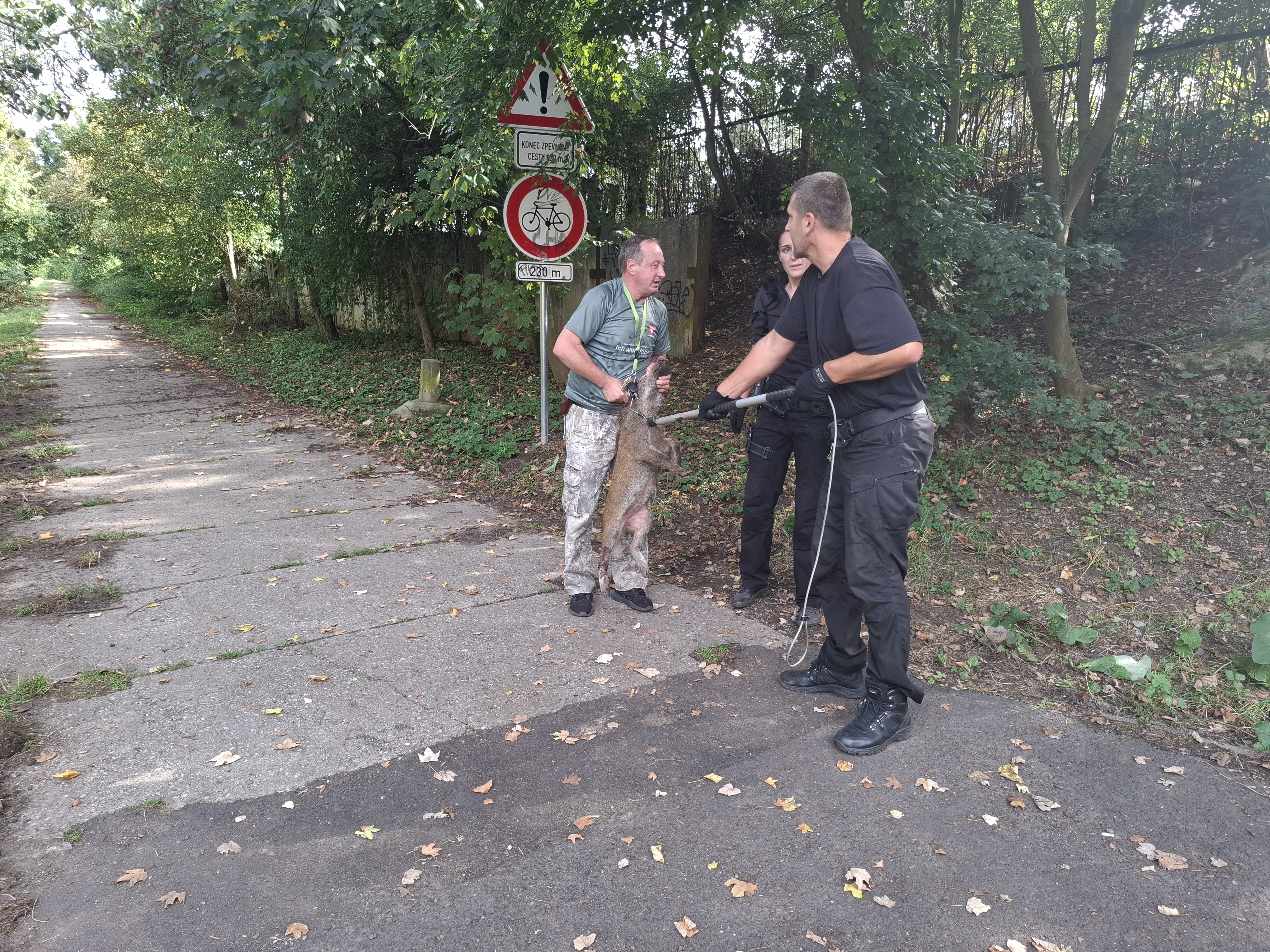 Dne 4.9.2025 v 17,50 hod., přijalo operační středisko městské policie hlášení od hasičů, ve kterém žádalo městskou policii o asistenci při odchytu divokého prasete v ulici Vinařská. Na místo byli vysláni strážníci ze skupiny operačního zákroku, kteří zjistili divoké prase, které si zaklínilo nohu v železném plotě, kterou si zlomilo a viselo za ní z cca 1,5m vysoko, hlavou dolů. Přítomní strážníci při zákroku použili odchytovou tyč, aby hasiči mohli velkou úhlovou bruskou odříznout kus železného plotu a strážníci mladého divočáka sundat na zem. Na místo byl přivolána myslivec z příslušného mysliveckého sdružení, který zvíře utratil.
