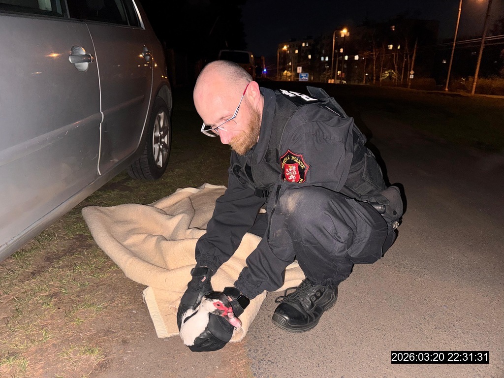Dne 20.3.2026 v 22,15 hod., byla na žádost operačního střediska městské policie vyslána hlídka strážníků do ulice Mezní, z důvodu oznámení, ve kterém oznamovatel operátorovi nahlásil, že mu na plotě sedí delší dobu kachna a možná se jedná o chovný druh. Hlídka opeřence odchytla a odvezla do městského útulku pro opuštěná zvířata.