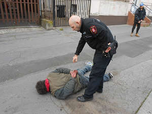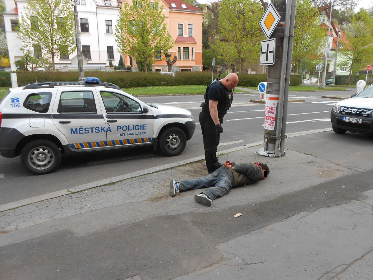 Dne 15.4.2017 v 11,40 hod., telefonoval na tísňovou linku městské policie neznámý oznamovatel, který operátorovi sdělil, že v ulici Masarykova leží na chodníku muž, který je možná zraněn. Strážníci na místě zjistili známého bezdomovce, který zde spal. Šetřením bylo zjištěno, že Vilém D.(1989), bytem Ústí nad Labem, se jako obvykle přivedl do podnapilého stavu a při svých toulkách městem usnul na schodech. Strážníci dotyčného probudili a z místa ho vykázali. Jmenovaný odešel směrem k Městským sadům a cestou strážníkovi vulgárně nadával. Po chvilce zastavil u osobního vozidla zn.Ford a začal kopat do pravých dveří a blatníku tohoto vozidla. Strážníci se k místu incidentu rozjeli, ale dotyčný po spatření hlídky se dal před nimi na útěk. To již ho sledovaly kamery městského dohlížecího kamerového systému a operátor hlídce prostřednictvím vysílačky hlásil směr pohybu pronásledovaného. Ten se obloukem vrátil k zmíněnému vozidlu a začal ho okopávat z druhé strany. Zde byl pan Vilém strážníky zadržen, zpacifikován a nakonec skončil v služebních poutech. Celý případ byl předán k dořešení příslušné přestupkové komisi.