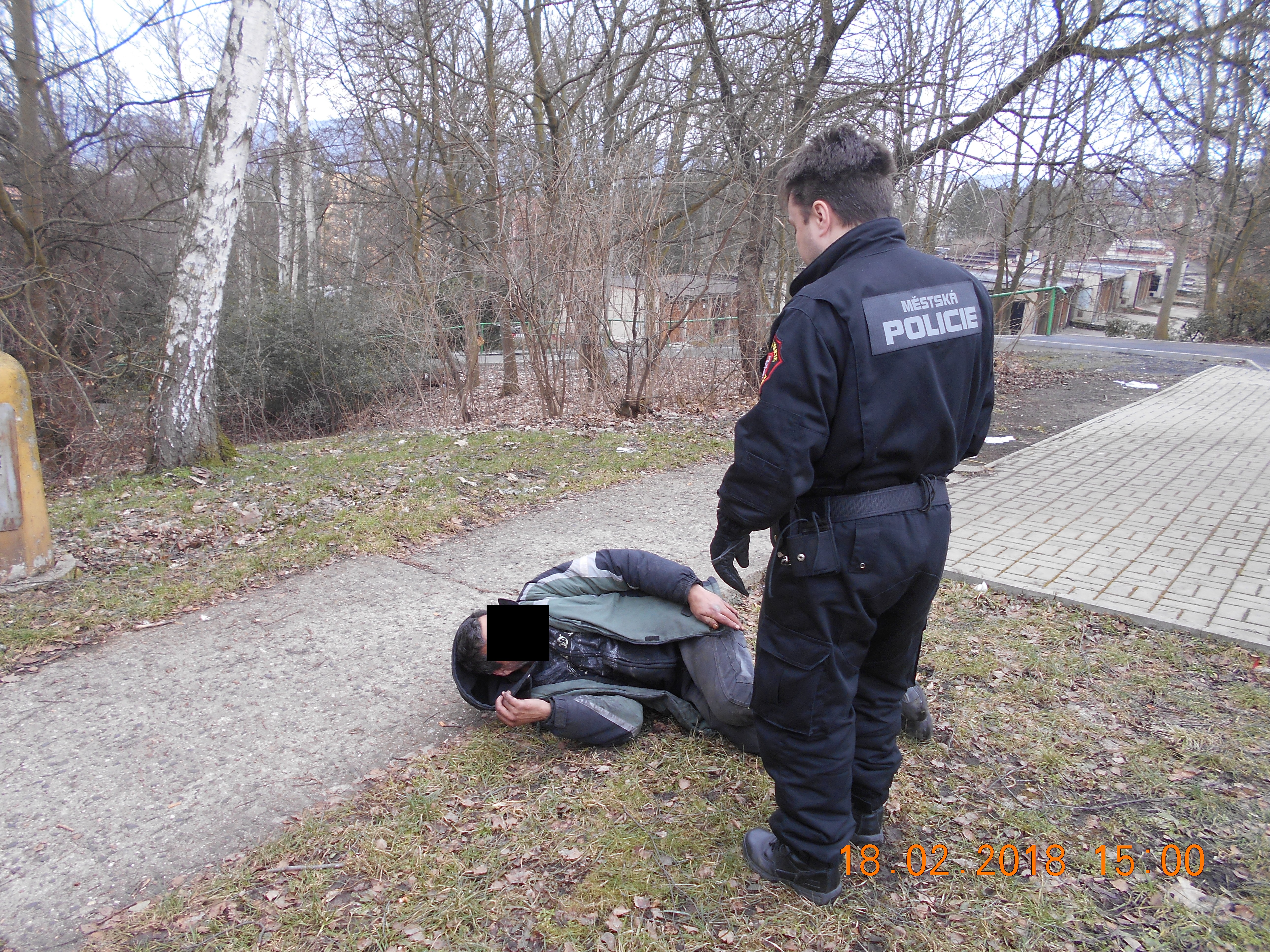 Dne 18.2.2018 ve 14.50 hod,. byla žádost operačního střediska městské policie vyslána hlídka strážníků do ul. Jana Zajíce, odkud na tísňovou linku městské policie telefonoval oznamovatel, který operátorovi sdělil, že po silnici chodí muž, který je pravděpodobně pod vlivem alkoholu a hrozí zde, že by ho mohlo srazit projíždějící vozidlo. Na místě i v okolí byla hlídkou provedena kontrola a muž odpovídající popisu byl zjištěn, jak spí na zemi za autobusovou zastávkou MHD u ulici Gagarinova. Jednalo se o muže středního věku ze Slovenska, kterého strážníci probudili a posadili na lavičku trolejbusové zastávky. Po chvilce, kdy dotyčný muž přišel k sobě a byl schopen se sám o sebe postarat, byl strážníky po řádném poučení z místa vykázán.
