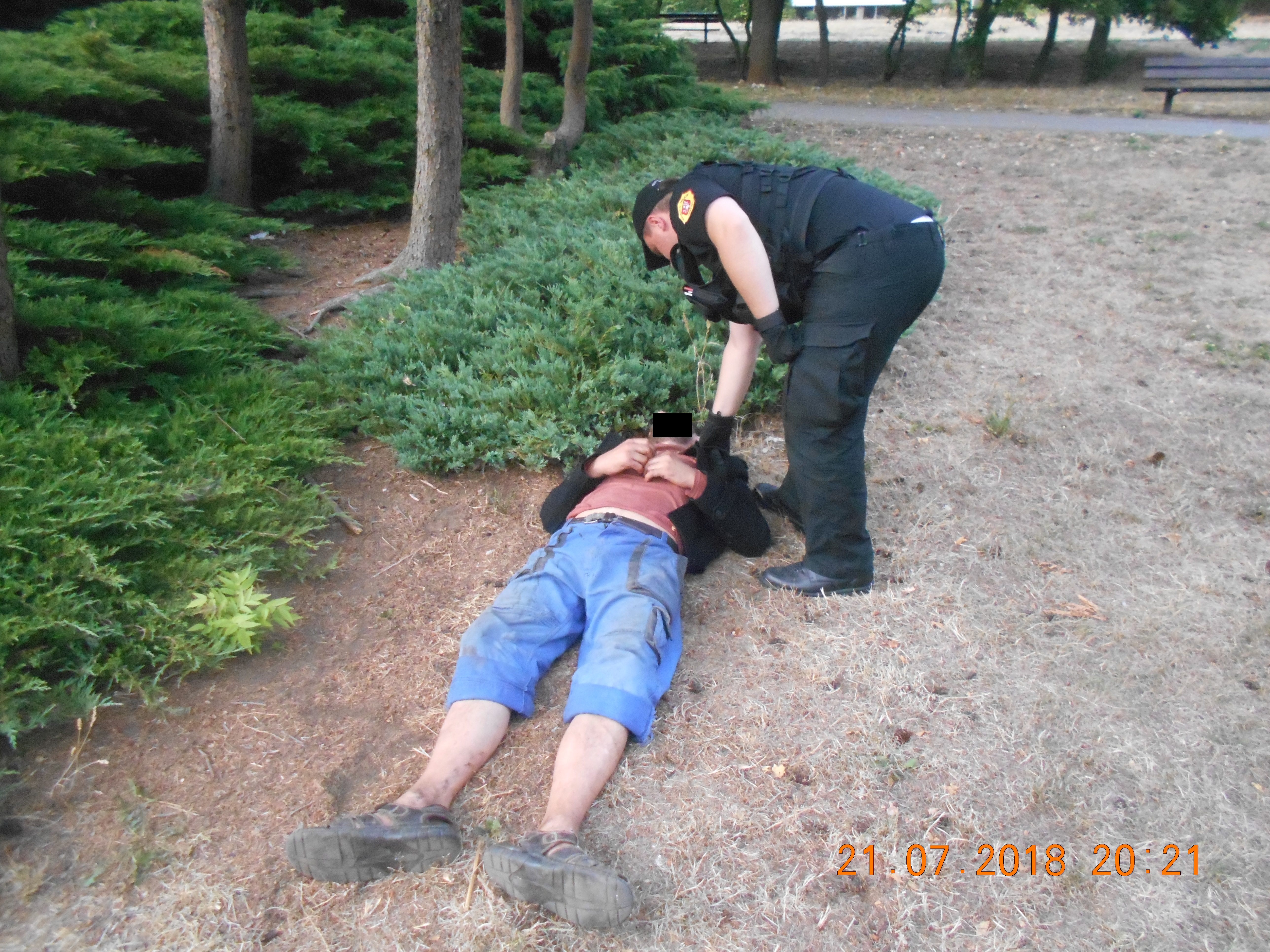 Dne 21.7.2018 ve 20.20 hod., prováděla hlídka strážníků kontrolní činnost v obvodu Severní Terasy, kde si v Centrálního parku všimla na zemi ležícího muže. Strážníci k muži přistoupili aby zjistili, zda není zraněn nebo nepotřebuje jakoukoli pomoc. Hlídka ale zjistila, že ležící muž nemá žádné zdravotní problémy, ale že je pouze značně opilý a setrvává v hlubokém spánku opilce. Strážníci dotyčného probudili a na místě s ním zůstali až do doby, kdy byl schopen se sám o sebe postarat. Poté byl muž středního věku z místa strážníky vykázán.