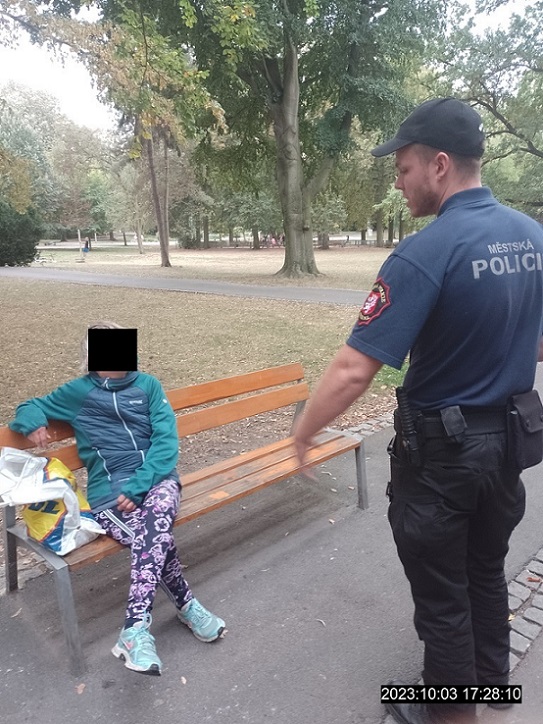 Dne 3.10.2023 v 17,20 hod., byla na žádost operačního střediska městské policie vyslána hlídka strážníků do Městských sadů, kde se dle oznamovatele měla nacházet na zemi ležící žena. Strážníci po příjezdu na místo ženu probudili a požádali ji o prokázání totožnosti. Ověřením přes základní registr obyvatel strážníci zjistili, že dotyčná se nachází v celostátním pátrání Policie ČR. Dechovou zkoušku na přítomnost alkoholu v dechu nebyla žena schopna vykonat. Z těchto důvodů byla hledaná na žádost policistů převezena na obvodní oddělení Policie ČR – Město, kde byla předána službu konajícímu policistovi.