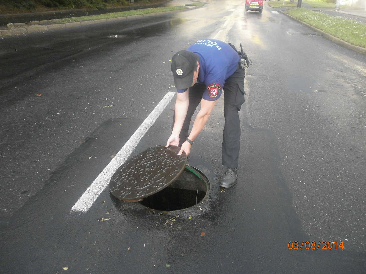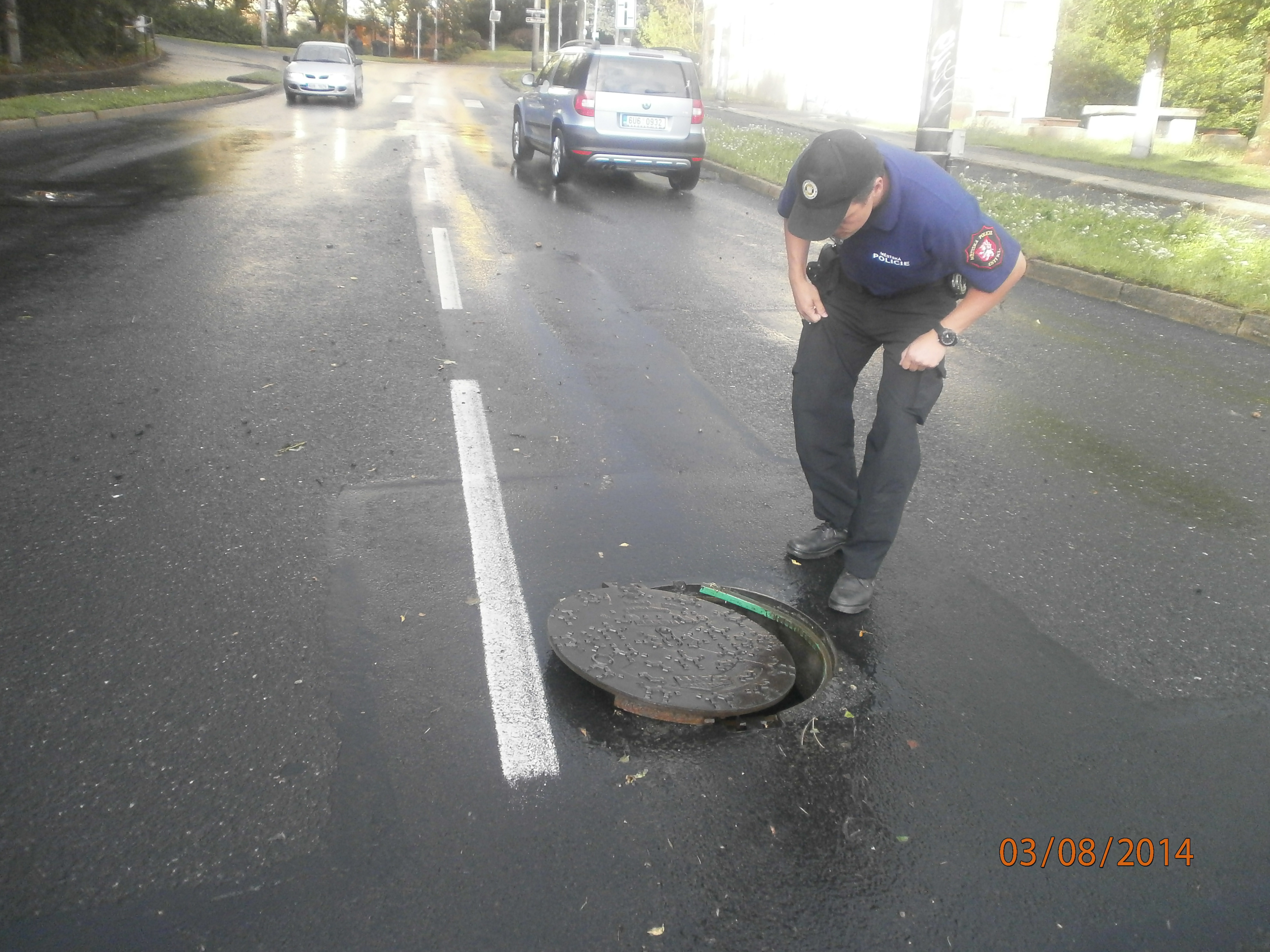 Dne 3.8.2014 v 18.20 hod., byla na žádost operačního střediska městské policie vyslána hlídka strážníků do ulice V Rokli, z důvodu telefonního oznámení na tísňovou linku městské policie od neznámého muže , který operátorovi oznámil , že po přívalovém dešti z vozovky vyčnívá vyklopený kanál. Po příjezdu hlídky na místo strážníci uvedli vše do původního stavu. Takto během večera zasahovali strážníci ještě třikrát, kdy po přívalovém dešti se některá víka od kanálových vpustí ocitla mimo kanálovou skruž.