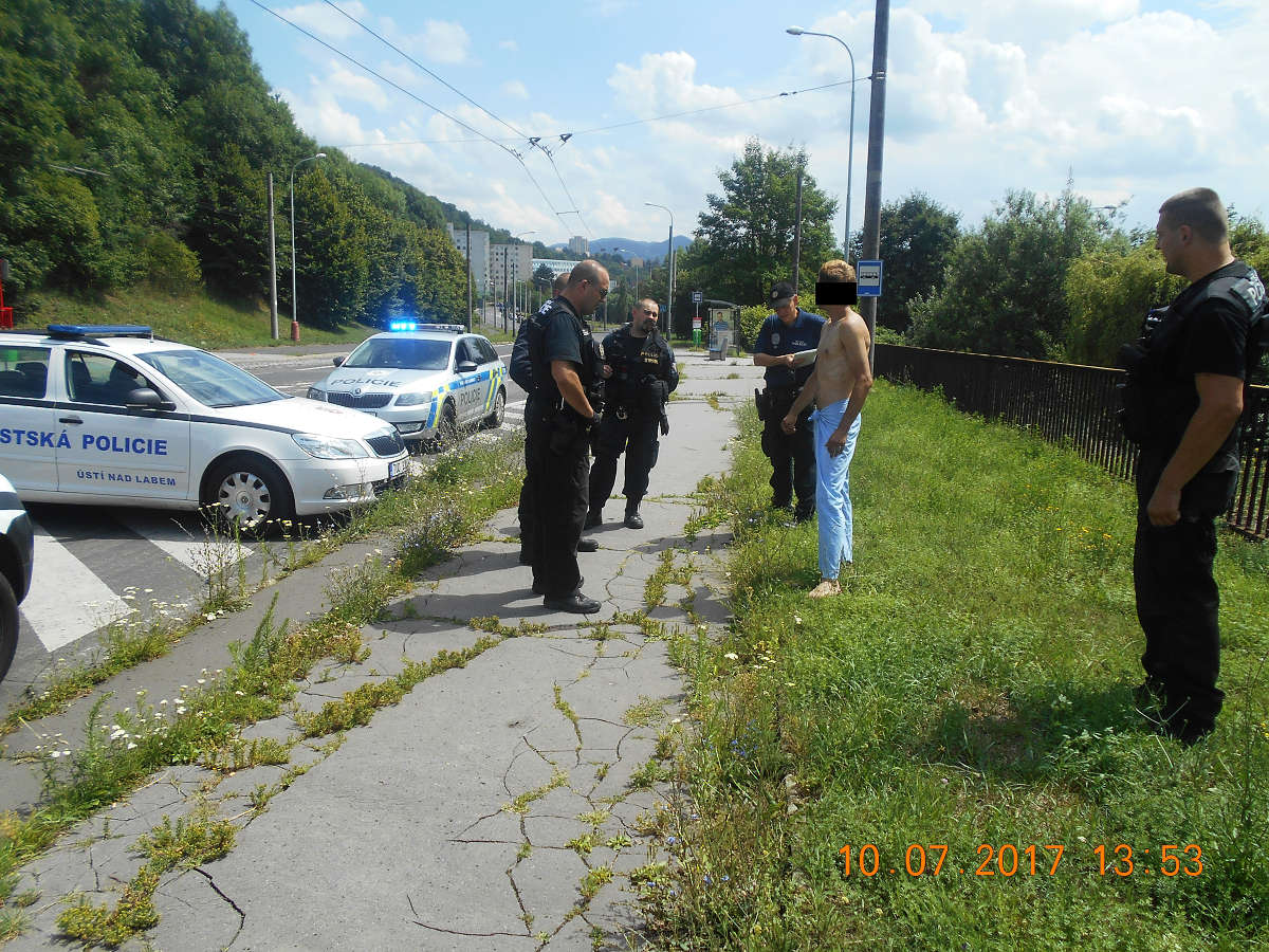 Dne 10.7.2017 v 13,50 hod., byl na žádost zaměstnanců psychiatrického oddělení Masarykovy nemocnice proveden výjezd strážníků do okolí nemocnice, odkud měl utéci pacient zmiňovaného oddělení, oblečený pouze v pyžamu. Přivolaní strážníci prohledávali ulice v okolí nemocnice a přilehlý les, ale pátrání nepřineslo kýžený výsledek. Štěstí se na strážníky usmálo až v ulici Vinařská, kde zmiňovaného pacienta zahlédla hlídka, která byla na pomoc přivolána z obvodu Město. V této ulici byl také po krátké honičce Jiří M.(1983), bytem Dubí strážníky zadržen. Na místo se dostavila i zdravotní záchranná služba, která si uprchlého pacienta převzala do vlastní péče a za asistence strážníků převezla zpět do Masarykovy nemocnice.