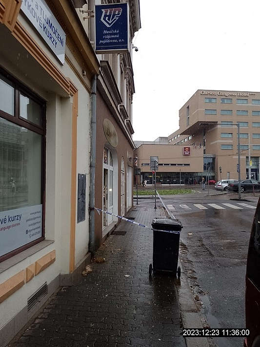 Dne 23.12.2023 v 11:42 hod., přijalo operační středisko městské policie informaci o padajícím zdivu z domu v ulici Vaníčkova. Na místo byla vyslána hlídka strážníků, která zjistila, že z římsy nad okapovým svodem padají na chodník kusy cihel a omítka. Hlídka se pokusila kontaktovat správce nemovitosti, což se nepodařilo. Šetřením zjistila jméno jednatelky firmy, která nemovitost vlastní a přes kontaktní osobu dceřiné firmy vlastníka byla jednatelka vyrozuměna. Místo bylo zabezpečeno proti vstupu nepovolaných osob vymezovací páskou, z důvodu nebezpečí úrazu a případné škodě na majetku.