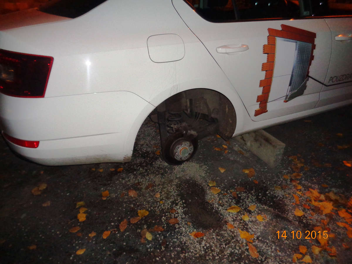 Dne 14.10.2015 v 02.20 hodin si hlídka strážníků všimla v ulici U Jeslí projíždějícího vozidla tovární značky VW Passat, které mělo na levém předním kole svlečenou pneumatiku a jelo pouze po ráfku a řidič svojí agresivní jízdou ohrožoval ostatní účastníky silničního provozu, především zaparkovaná vozidla. Přivolaná autohlídka se vydala za výše uvedeným vozidlem a pokoušela se jej zastavit světelným výstražným zařízením. To se podařilo až v další ulici, kde vozidlu v jedné ze zatáček upadlo přední kolo. Ve vozidle se nacházel pouze řidič, který na výzvu strážníků vystoupil z vozidla a velmi se podivoval nad ztrátou kola. Vzhledem k tomu, že z muže byl cítit alkohol, byla na místo přivolána Policie ČR. Dle předloženého občanského průkazu bylo zjištěno, že se jedná o Jiřího Š.(1979), bytem, Bechlín okr. Litoměřice. Ještě před příjezdem hlídky Policie ČR trval jmenovaný na výměně upadlého kola. V okamžiku, kdy dotyčný otevřel kufr vozidla, všimla si hlídka dvou pneumatik na různých ráfcích, poházeného nářadí a krytky kola s logem Škoda. Strážníci pojali podezření, že toto kolo může pocházet z trestné činnosti, proto se jeden ze strážníků vydal po stopě, kterou na vozovce zanechal ráfek zmíněného vozidla, až došel do ulice Černá stezka, kde objevil zaparkovaný osobní automobil zn. Škoda Octavia, kterému chybělo pravé zadní kolo. Strážníci kontaktovali majitele vozidla, jenž jim sdělil, že kolo v kufru zřejmě patří na jeho vozidlo. Celý případ si převzala k dořešení Policie ČR.
