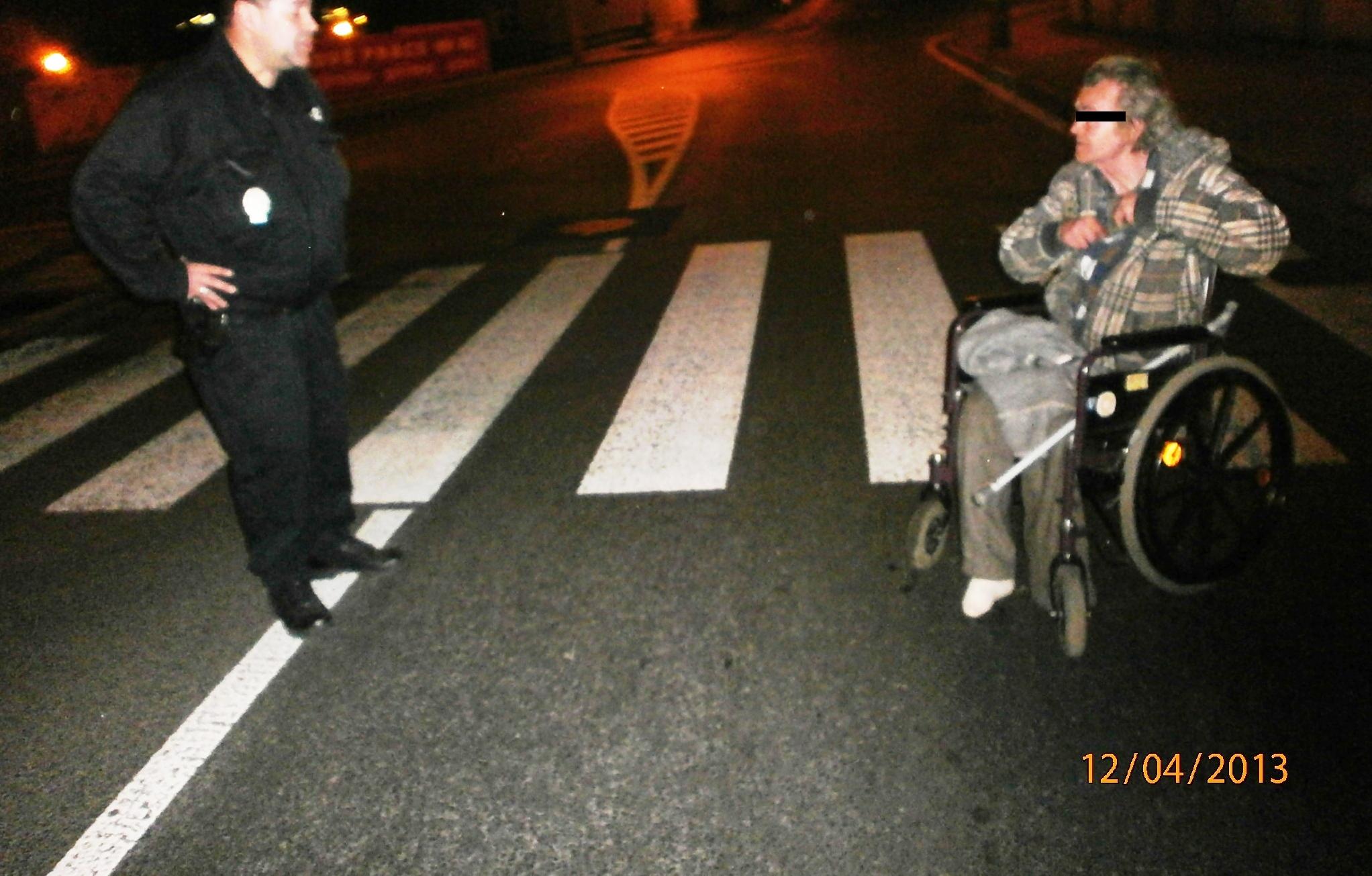 Dne 12.4.2013 v 22.10 hod., telefonoval na tísňovou linku městské polcie neznámý muž, který sdělil, že se v ulici Londýnská pohybuje na invalidním vozíku podnapilý muž a svýn chováním ohrožuje bezpečnost a plynulost silničního provozu. Na místo byla vyslána hlídka strážníků, která zde zadržela Pavla K.(1952), který strážníkům sdělil, že z ulice neodjede a že se chce nechat přejet autem. Z tohoto důvodu byla na místo přivolána rychlá záchranná služba, která si jmenovaného převezla k vyšetření na psychiatrické oddělení do Masarykovy nemocnice. Pro značnou agresivitu jmenovaného, musela při převozu dotyčného asistovat hlídka strážníků.