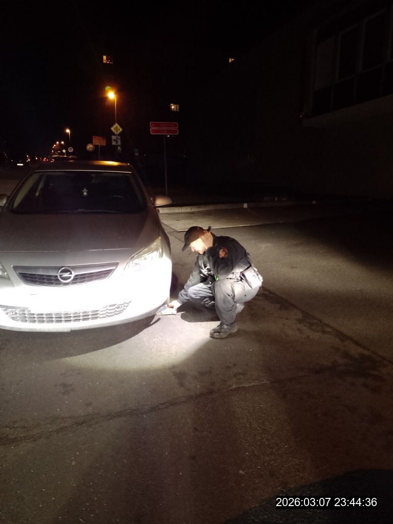 Dne 7.3.2026 v 23,20 hod., prováděla hlídka strážníků kontrolní činnost v ulici Svojsíkova, kde si všimla pomalu se rozjíždějícího osobního vozidla, ve které ale chyběl řidič. Strážníci ihned přispěchali k vozidlu a vlastními silami ho zastavili. Poté přední kola podložili cihlami, aby se vozidlo nemohlo dát opět do pohybu, neboť se nacházelo na mírně se svažující vozovce. Lustrací byla zjištěna majitelka vozidla, se kterou se strážníci telefonicky spojili, aby ji informovali o nastalé události. Ta se ale nemohla na místo dostavit, proto poslala svou sestru, která se na místo dostavila a s vozidlem odjela.
