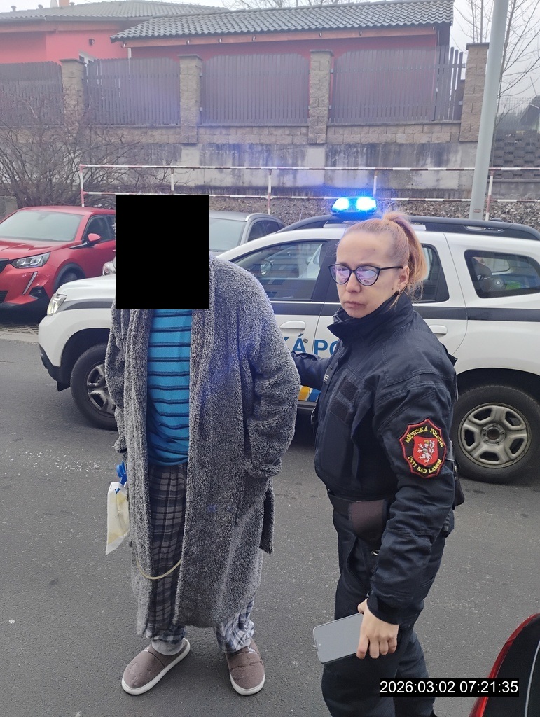 Dne 02.03.2026 v 07:05 hod., byla operačním střediskem městské policie vyslána hlídka strážníků do ulice Na Výšině , kde se měl dle oznamovatele procházet muž vyššího věku, oděn pouze v pyžamu, zjevně zmatený a pravděpodobně duševně nemocný. Strážníkům se dotyčného podařilo nalézt, ale ten nebyl schopen hlídce sdělit, kde bydlí a jak se na ulici dostal. Celému případu pomohla náhoda, kdy kolem hlídky projížděla pečovatelka, která se o muže stará a měla u sebe klíče od jeho bytu. Po domluvě se strážníky si pečovatelka muže od hlídky převzala a odvedla domů. Dále hlídka telefonicky kontaktovala i manželku seniora, která byla toho času v zaměstnání a informovala jí o celé události.