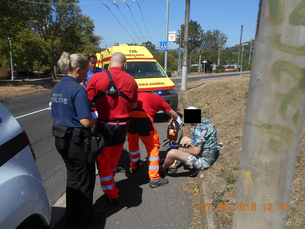 Dne 7.8.2018 v 12,30 hod., prováděla hlídka městských strážníků pochůzkovou činnost v obvodu Severní Terasy, kde je zastihla zpráva, že v ulici Mírová sedí muž, který má zřejmě zdravotní problémy. Strážníci dotyčného spatřili na zastávce MHD a když se ho zeptali, jaké má zdravotní problémy, muž odpověděl, že ho postihla náhlá nevolnost z horka. Z těchto důvodů byla k muži vyššího věku přivolána zdravotní záchranná služba, která si seniora odvezla do Masarykovy nemocnice k ošetření.
