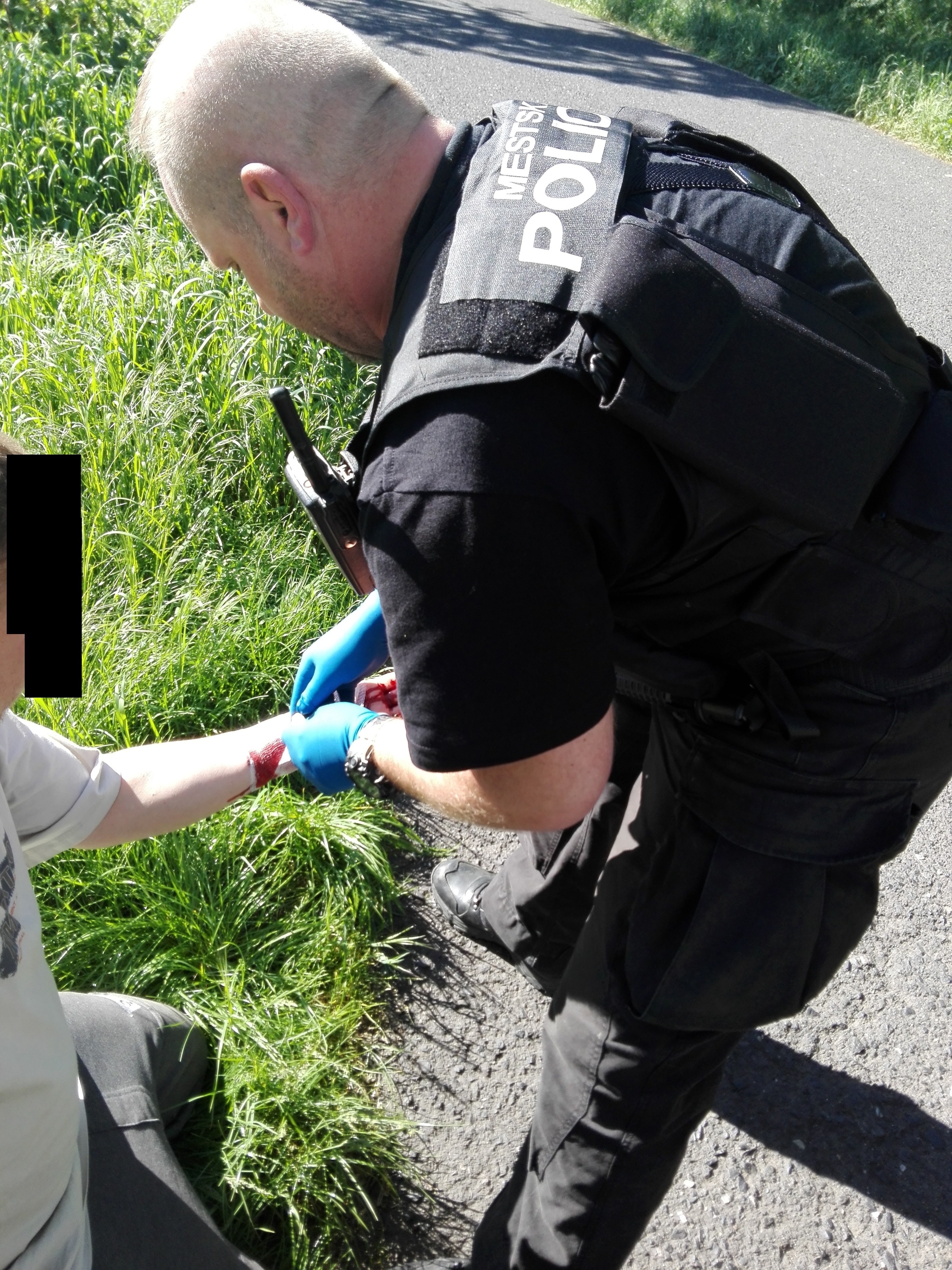Dne 6.5.2018 v 15.50 hod., byl na žádost operačního střediska městské policie proveden výjezd strážníků do lokality Žežice, kde se měl dle oznamovatele pohybovat muž, který se údajně měl pokusit o sebevraždu. Hlídka provedla kontrolu uvedené lokality, ale nikoho zde nenalezla, proto byla následně provedena kontrola pozemní komunikace Žežice, směr Neštěmice. Zde hlídka zjistila muže, který krvácel ze zápěstí levé ruky. Strážníci muži poskytli první pomoc, a to zastavení krvácení za pomocí obvazového materiálu. Při poskytování první pomoci byly zjištěny několika násobné příčné řezné rány v zápěstí levé ruky. Muž hlídce sdělil, že má dlouhodobé nespecifikované problémy, proto si zápěstí pořezal žiletkou. Po ošetření muže se na místo dostavila přivolaná zdravotní záchranná služba, která si dotyčného převezla do Masarykovy nemocnice k dalšímu ošetření.