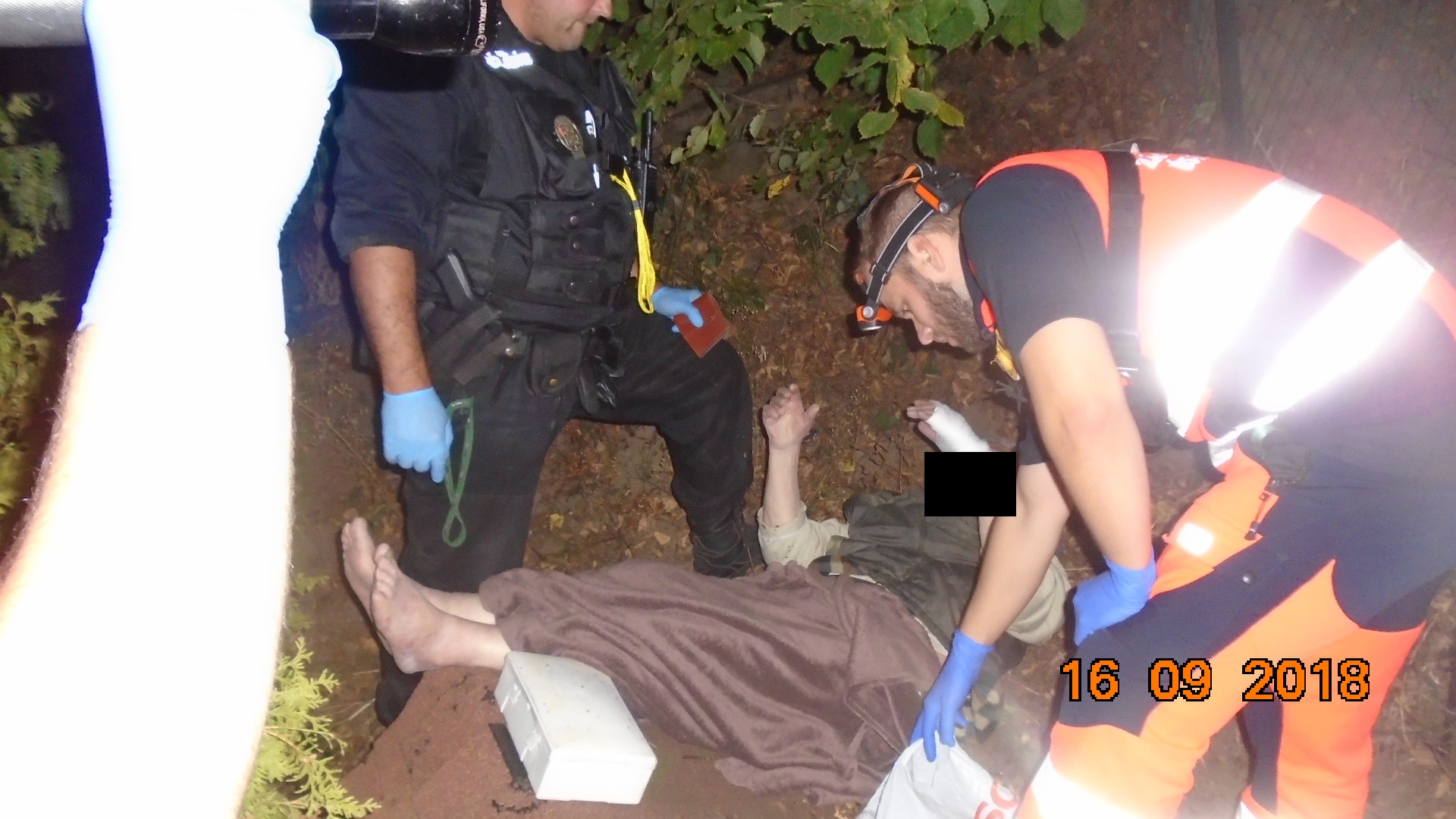 Dne 16.9. 2018 v 20:15 hod., byla na žádost operačního střediska městské policie vyslána autohlídka strážníků do ulice Pavla Stránského, z důvodu přijatého telefonického oznámení na tísňovou linku strážníků, kdy oznamovatel operátorovi uvedl, že za plotem jejich pozemku se nachází zraněný muž, který volá o pomoc. Po příjezdu hlídky na místo byl skutečně zjištěn za plotem v prudkém svažitém lesním terénu starý muž, který hlídce uvedl, že uklouzl po listí, spadl ze svahu a zastavil se až o plot pozemku. Muž vyššího věku si strážníkům stěžoval na zraněnou levou paži, kde měl tržnou ránu na malíkové hraně ruky. Na dotaz hlídky jak dlouho se zde v této pozici nachází, senior odpověděl, že asi dvacet minut. Po tomto zjištění byla muži poskytnuta první pomoc a na místo byla přivolána zdravotní záchranná služba. Před příjezdem zdravotníků rozebrali strážníci plotové pole, aby mohl být postižený pomocí evakuační plachty odtransportován do sanitního vozu. Poté byl senior převezen do Masarykovy nemocnice k dalšímu ošetření.