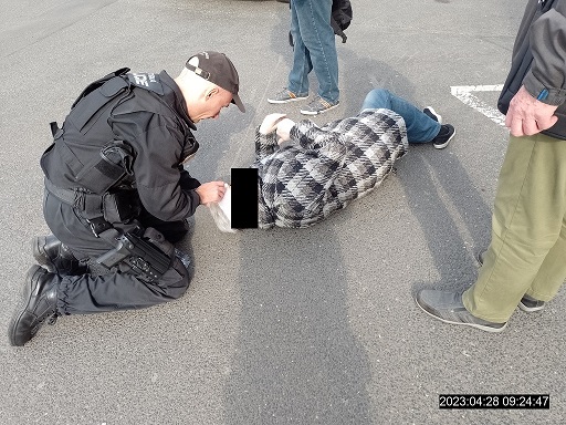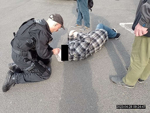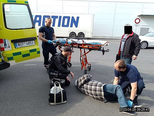Dne 28.4.2023 od 08.00 hod. prováděla hlídka městských strážníků kontrolní činnost v obvodu Severní Terasy, kde si v ulici Krušnohorská všimla u obchodního centra Albert na zemi ležící neznámé ženy, u které stáli dva muži. Od nich bylo zjištěno, že neznámá žena šla před nimi, zkolabovala a upadla na zem. Dále oba svědci uvedli, že při pádu se dotyčná udeřila do temene hlavy. T těchto důvodů byla jedním ze svědků na místo přivolána zdravotní záchranná služba. Hlídka strážníků přistoupila k neznámé ženě aby zjistila její zdravotní stav. Seniorka strážníkům sdělila, že se jí náhle zatočila hlava a ona upadla na zem. Dále si stěžovala na bolest hlavy a levé nohy. Když strážníci kontrolovali ženě hlavu všimli si, že důsledkem pádu žena utrpěla tržnou ránu na temeni hlavy. Strážníci okamžitě zraněné poskytli první pomoc. V tomto okamžiku se na místo dostavila zdravotní záchranná služba, která si neznámou ženu od strážníku převzala a pokračovala s prvotním ošetřením. Po tomto ošetření hlídka pomohla záchranářům zraněnou naložit na nosítka a dopravit do sanitního vozu. Poté byla žena zdravotníky odvezena do Masarykovy nemocnice k dalšímu ošetření. Dodatečným šetřením bylo zjištěno, že se jednalo o 82 letou seniorku bytem Ústí nad Labem.