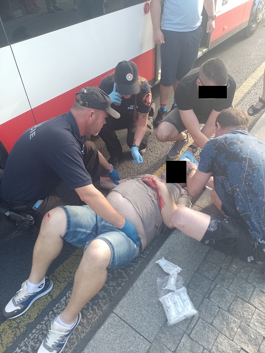 V 18.05 hodin, při projíždění ulicí Hrnčířská, bylo uvedenou hlídkou zjištěno, že poblíž objektu hotelu Bohemia došlo k dopravní nehodě, při které se trolejbus MHD střetl s chodcem, který přecházel vozovku po přechodu pro chodce. Po zastavení služebního vozidla hlídka na místě zjistila, že za přechodem na zemi leží muž, který silně krvácel z hlavy a dále měl po těle další krvácející zranění. Po zajištění místa dopravní nehody a ujištění se, že jedna z přihlížejících osob přivolala zdravotní záchrannou službu, začali přítomní strážníci dotyčnému poskytovat první pomoc, a to za asistence operátorky zdravotní záchranné služby, se kterou byli po celou dobu v telefonním kontaktu. Zasahující strážníci chroptícímu muži uvolnili dýchací cesty zakloněním hlavy a následně zastavili krvácející zranění na hlavě, které mu obvázali obvazem. Dále po celou dobu s mužem navazovali kontakt, aby neupadal do bezvědomí a jeho stav a dechovou frekvenci průběžně konzultovali se zmiňovanou operátorku. Po chvíli se namísto dostavili zdravotníci ze záchranné služby, kteří si zraněného muže středního věku od strážníků převzali k dalšímu ošetření. Na místo se následně dostavila hlídka Policie ČR - dopravní nehody, která si celou událost převzala k dořešení.