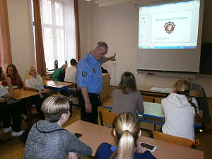 Strážníci z oddělení prevence kriminality v rámci předmětu "veřejná správa" informovali studenty čtvrtého ročníku o činnosti Městské policie.