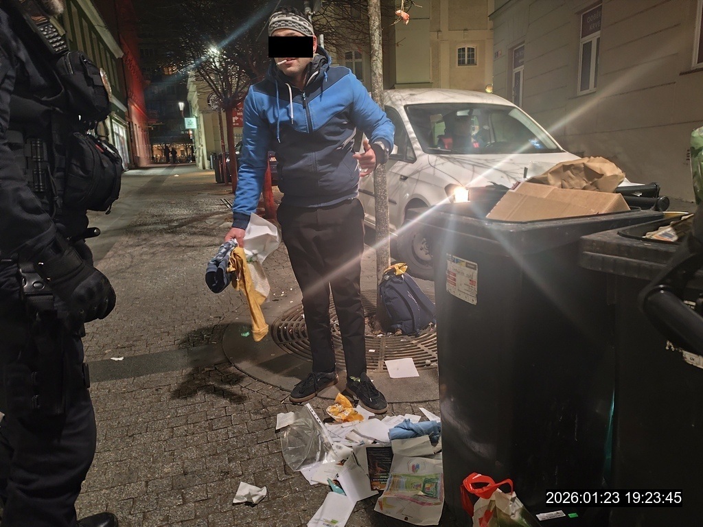Dne 23.1.2026 v 19:20hod., prováděla hlídka strážníků kontrolní činnost v centru města, kde v ulici V Jirchářích narazila na muže, který se přehraboval v kontejnerech na domovní odpad a věci, které se mu nehodili, vyhazoval na zem. Hlídka muži přikázala místo uklidit, což udělal, a poté dotyčného z místa vykázala.