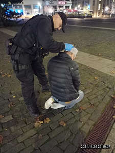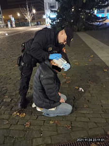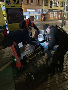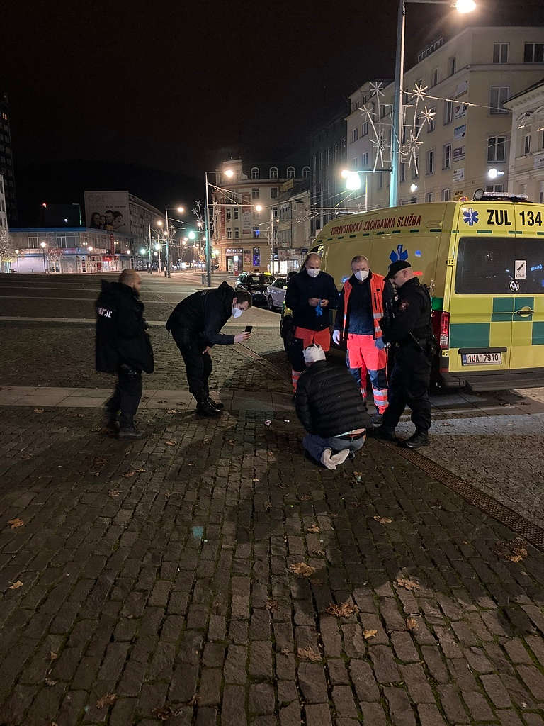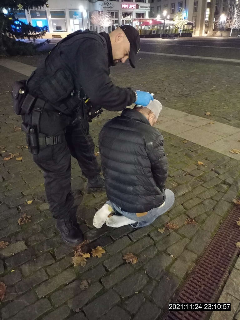 Dne 24. 11. 2021 v 22:58 hod., byla na žádost operačního střediska městské policie vyslána hlídka strážníků na Mírové náměstí k Vánočnímu stromu, kde se má dle oznamovatele nacházet zraněný muž. Po příchodu hlídky na místo, byl zjištěn zraněný muž s tržnou krvácející ránou na hlavě, silnými otoky v obličeji a s krvácejícími ústy. Strážníci muži poskytli první pomoc a na místo přivolali zdravotní záchrannou službu. Od zraněného muže se strážníci dozvěděli, že byl přepaden čtyřmi muži, kteří mu odcizili boty a peněženku i s doklady a poté z místa činu utekli neznámo kam. Vzhledem k okolnostem celé události byla na místo přivolána hlídka Policie ČR, která si celý případ převzala k dalšímu šetření.